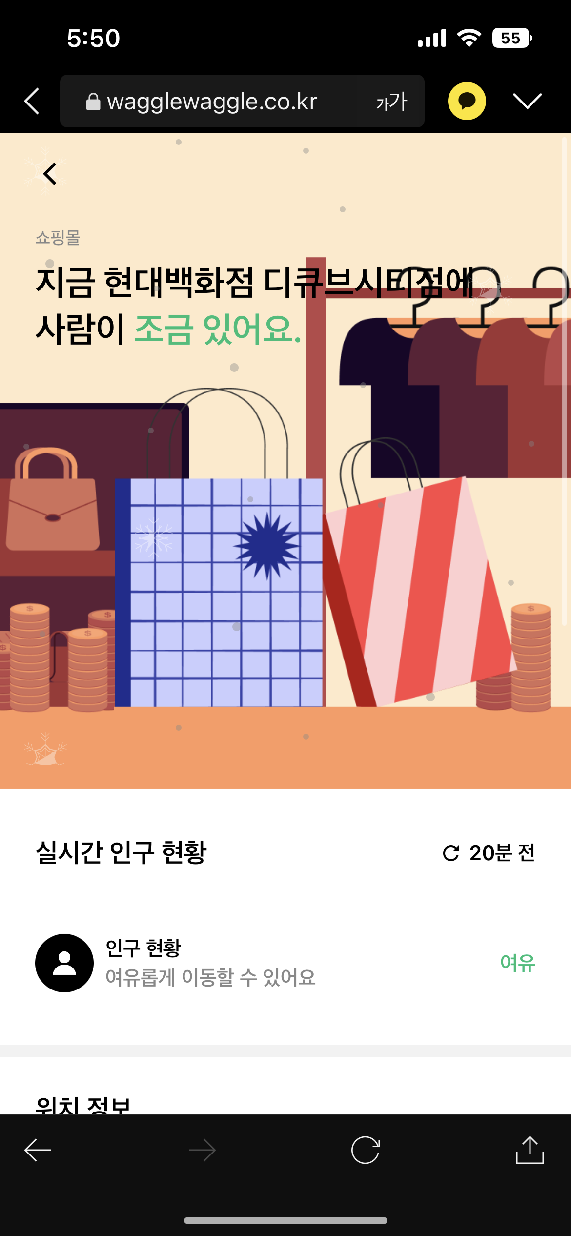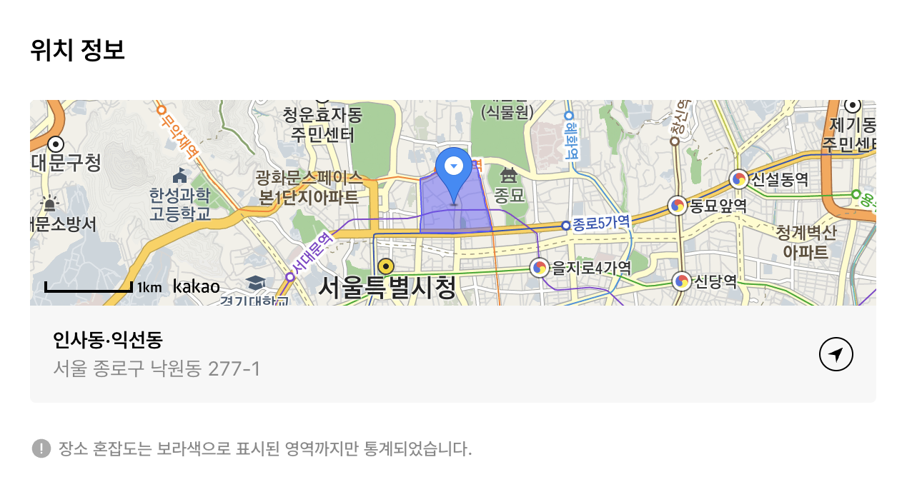- 위치 정보란에 "장소 혼잡도는 보라색으로 표시된 영역까지만 통계되었습니다." 안내 문구 출력