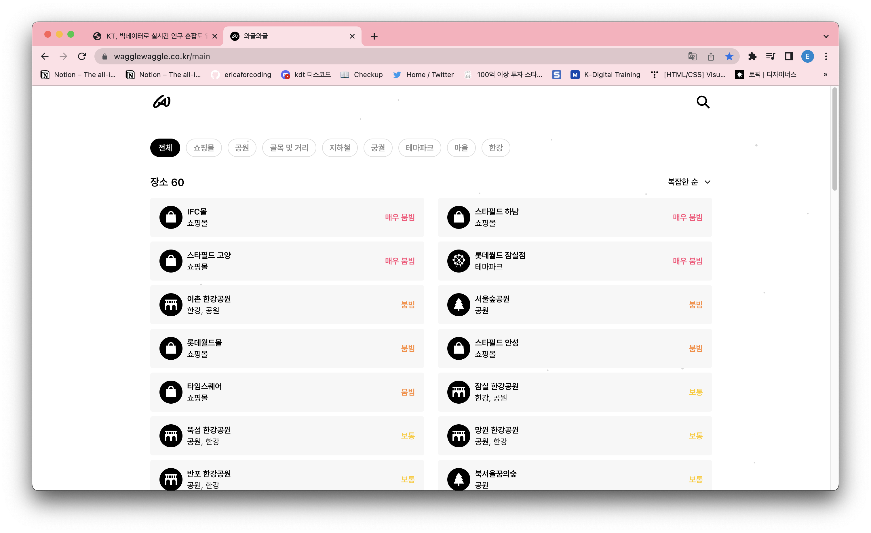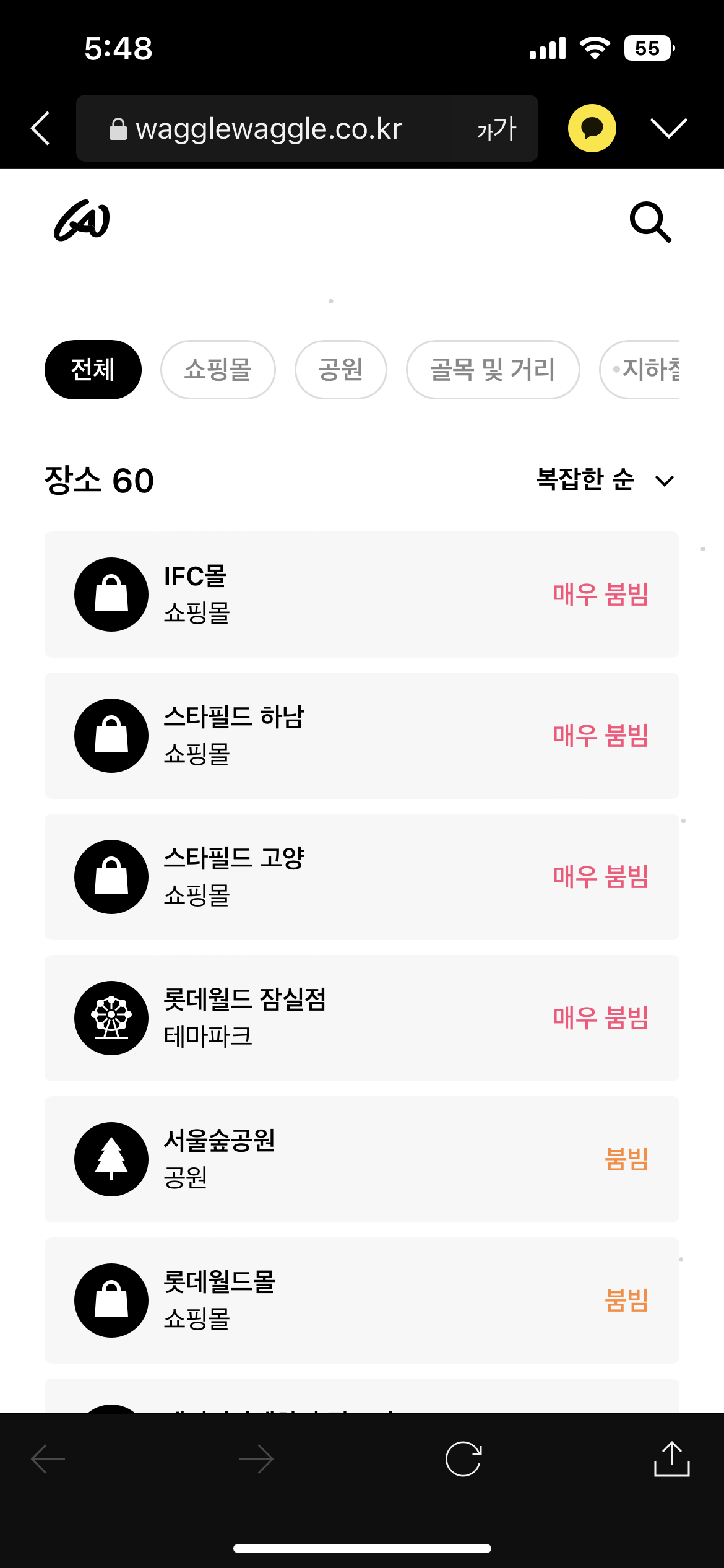 - 장소는 전체, 필터는 복잡한 순으로 기본 출력