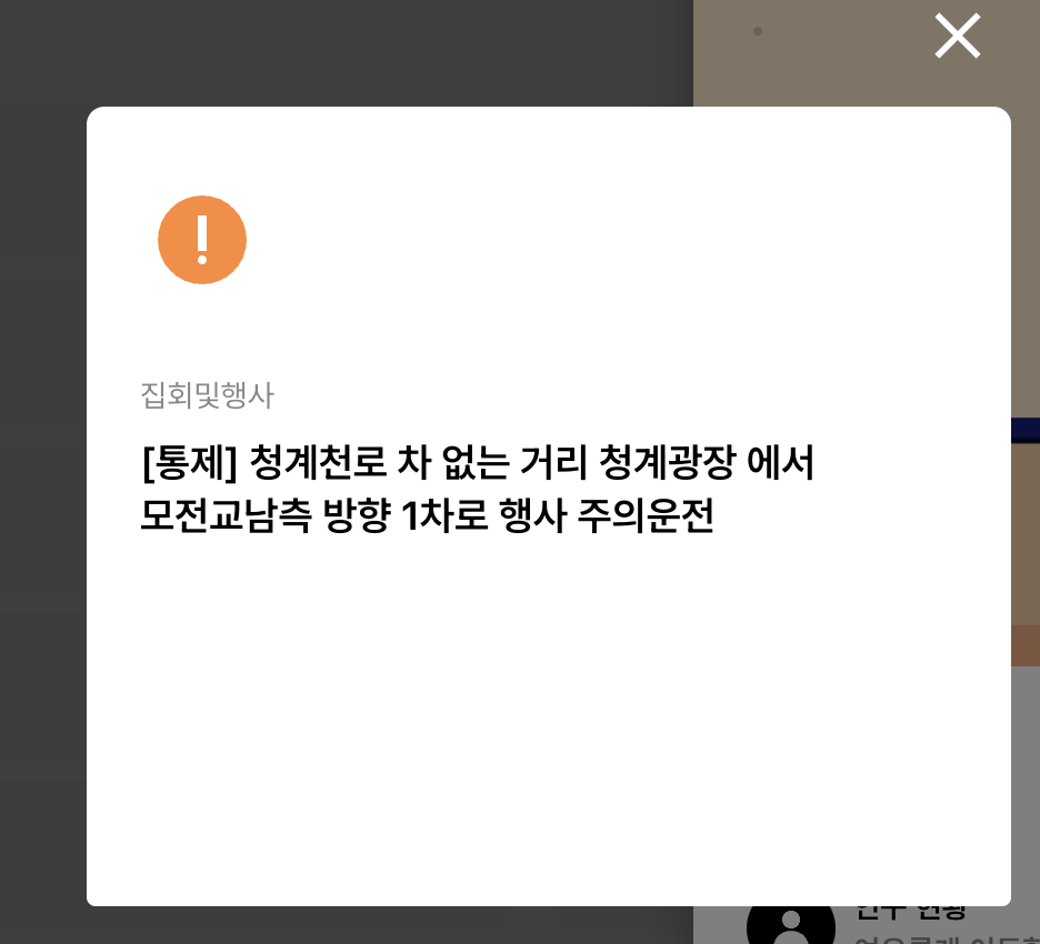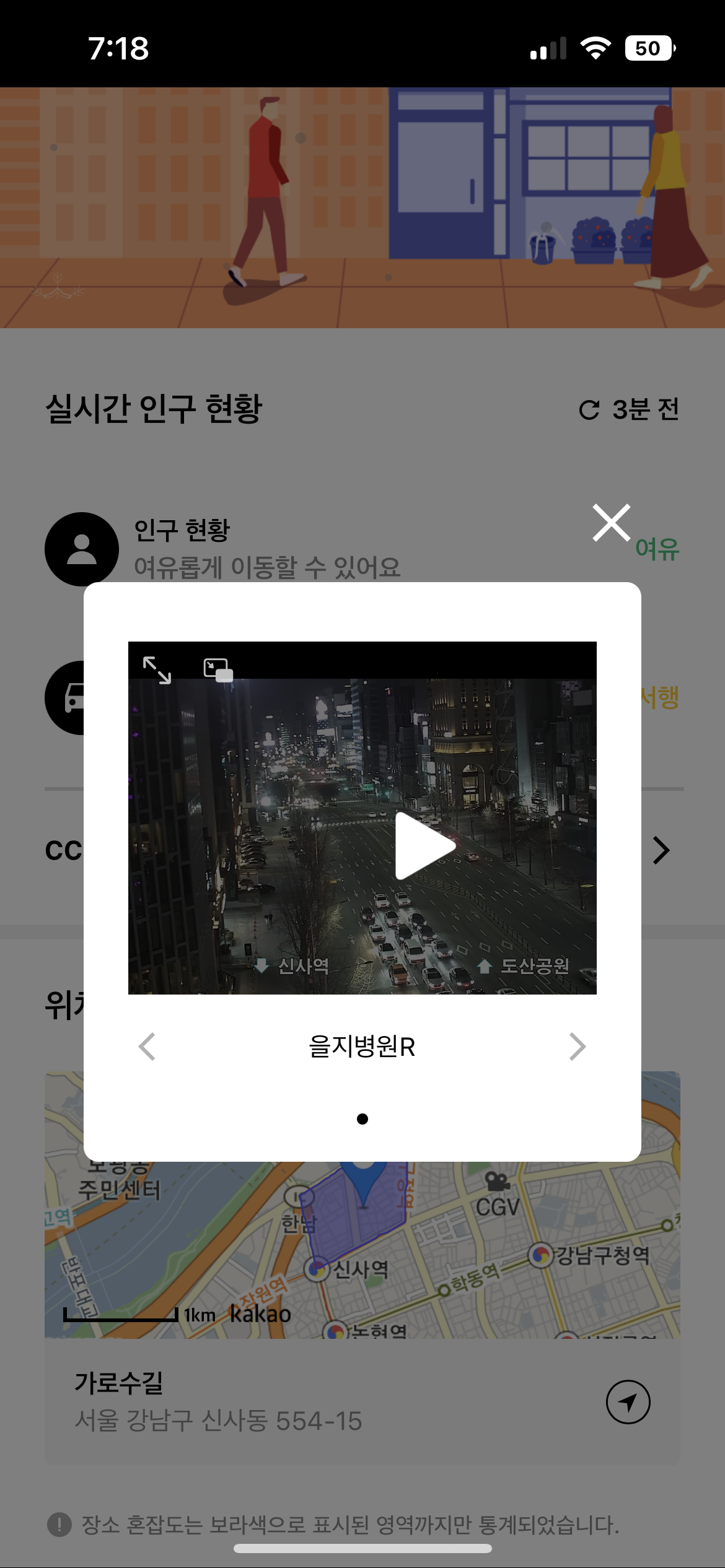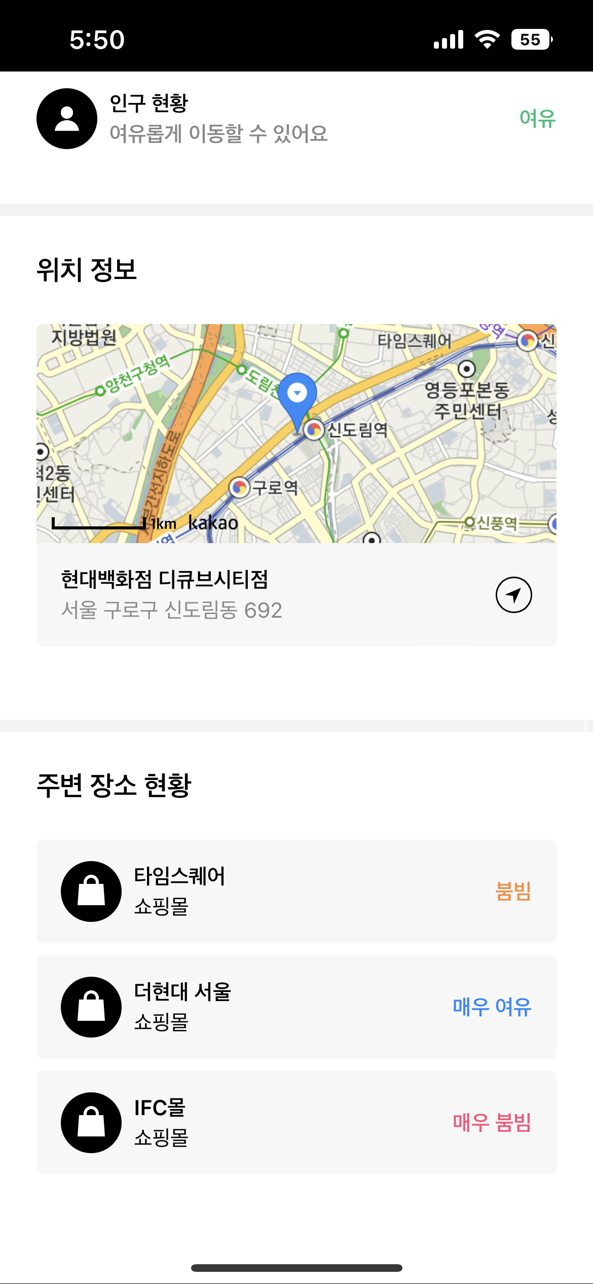 - 위치 정보란에 "장소 혼잡도는 보라색으로 표시된 영역까지만 통계되었습니다." 안내 문구 출력