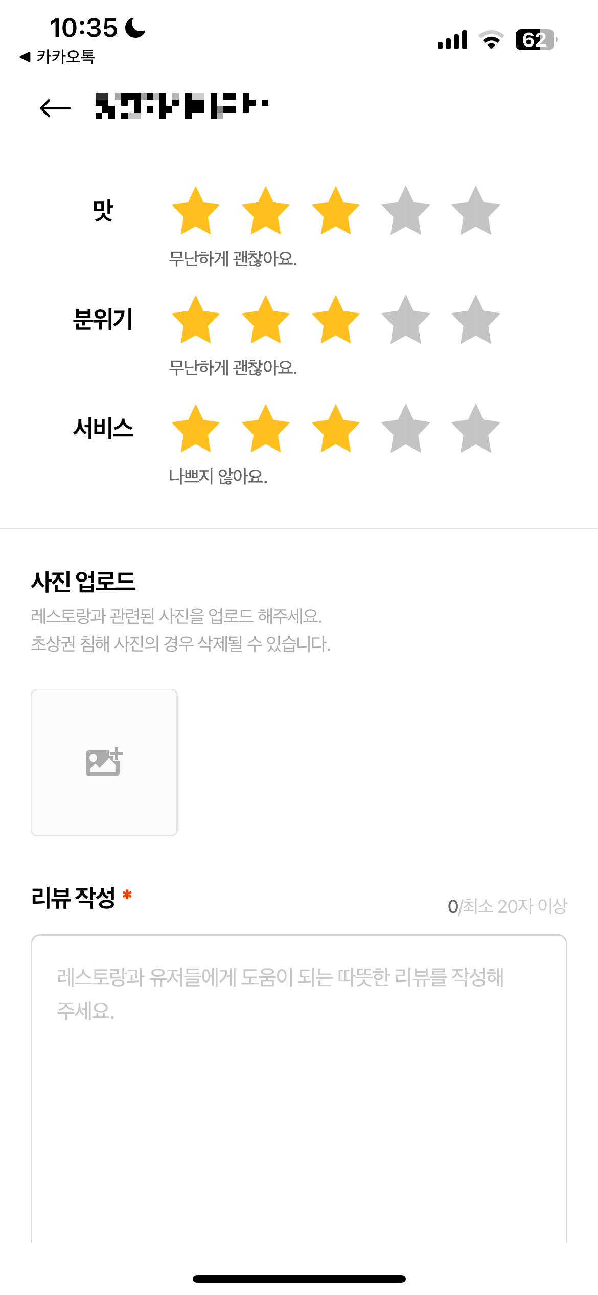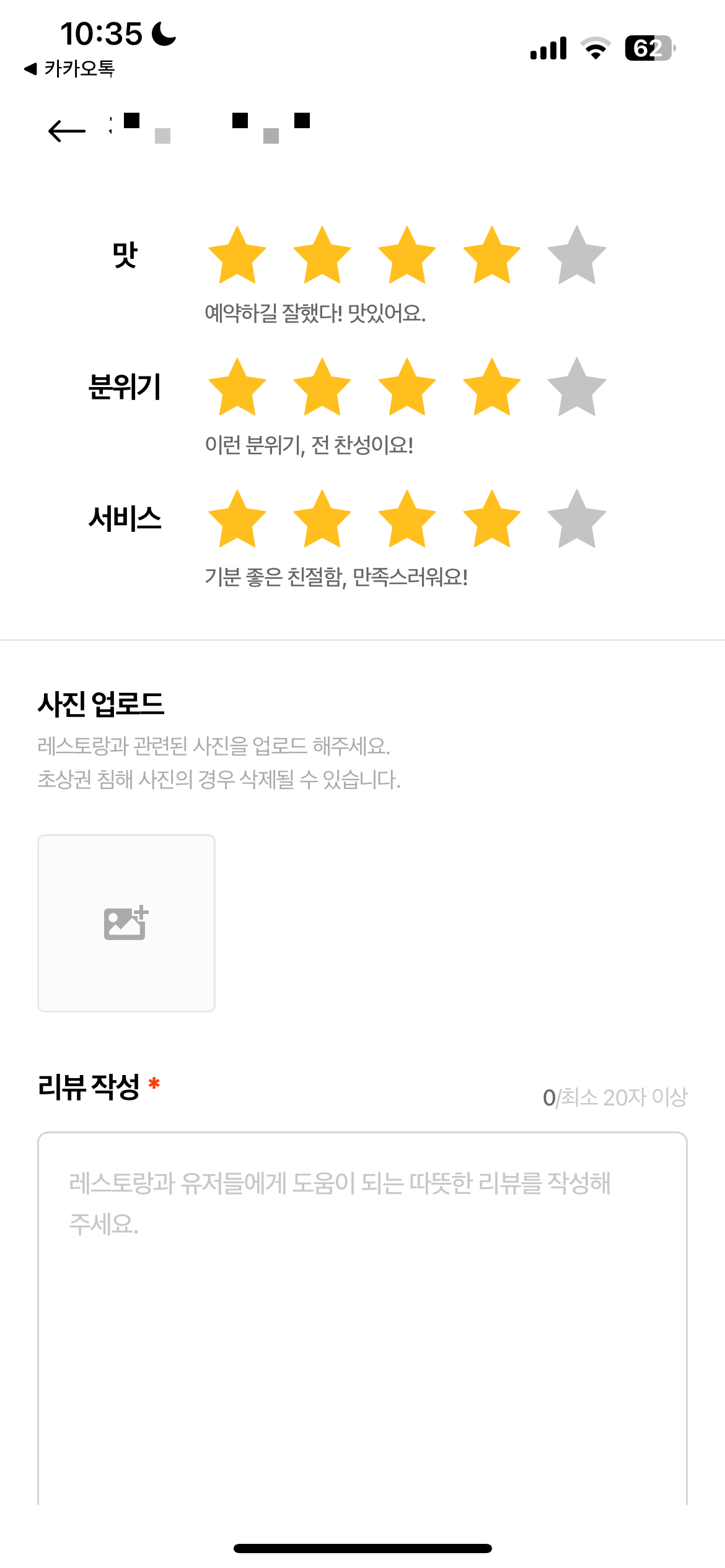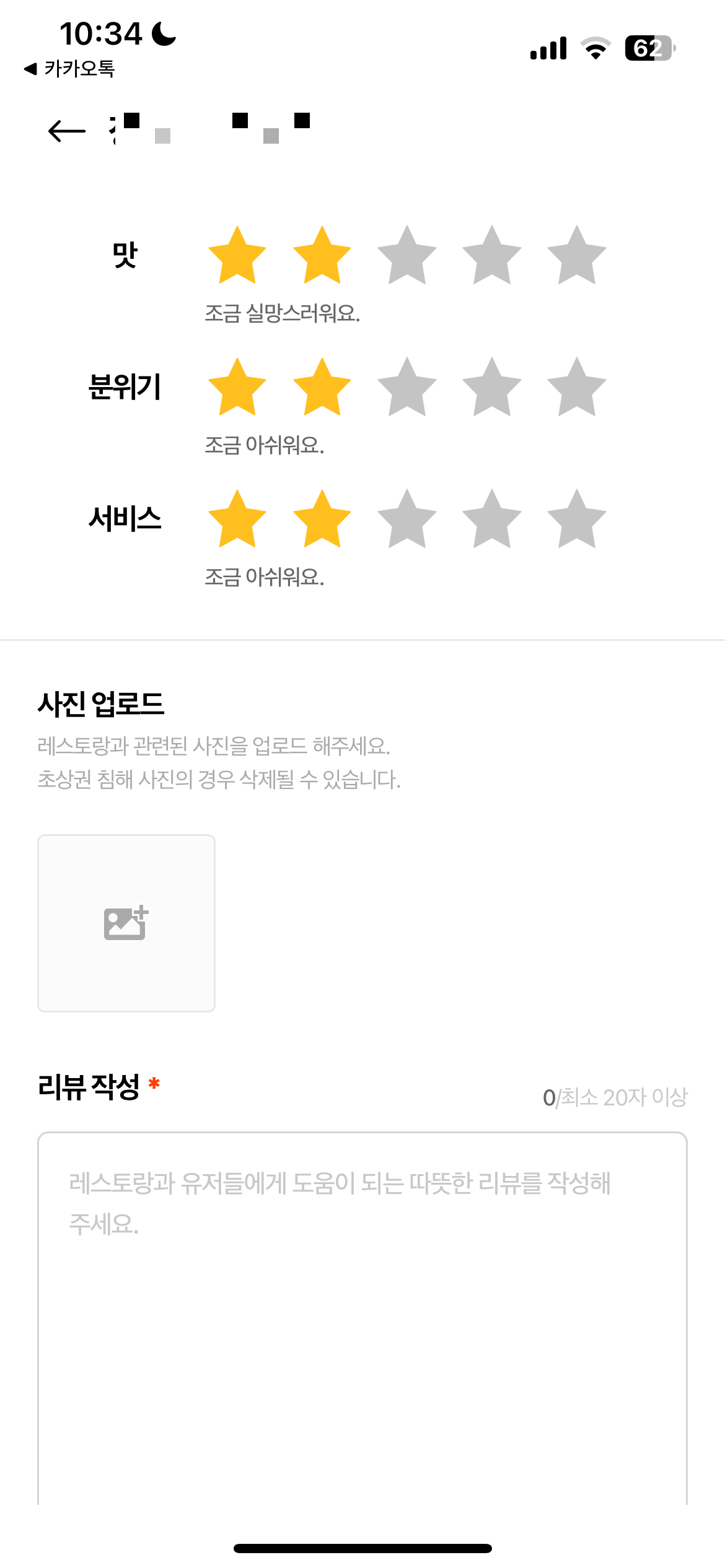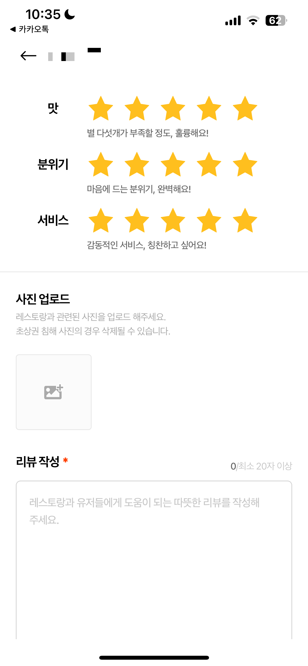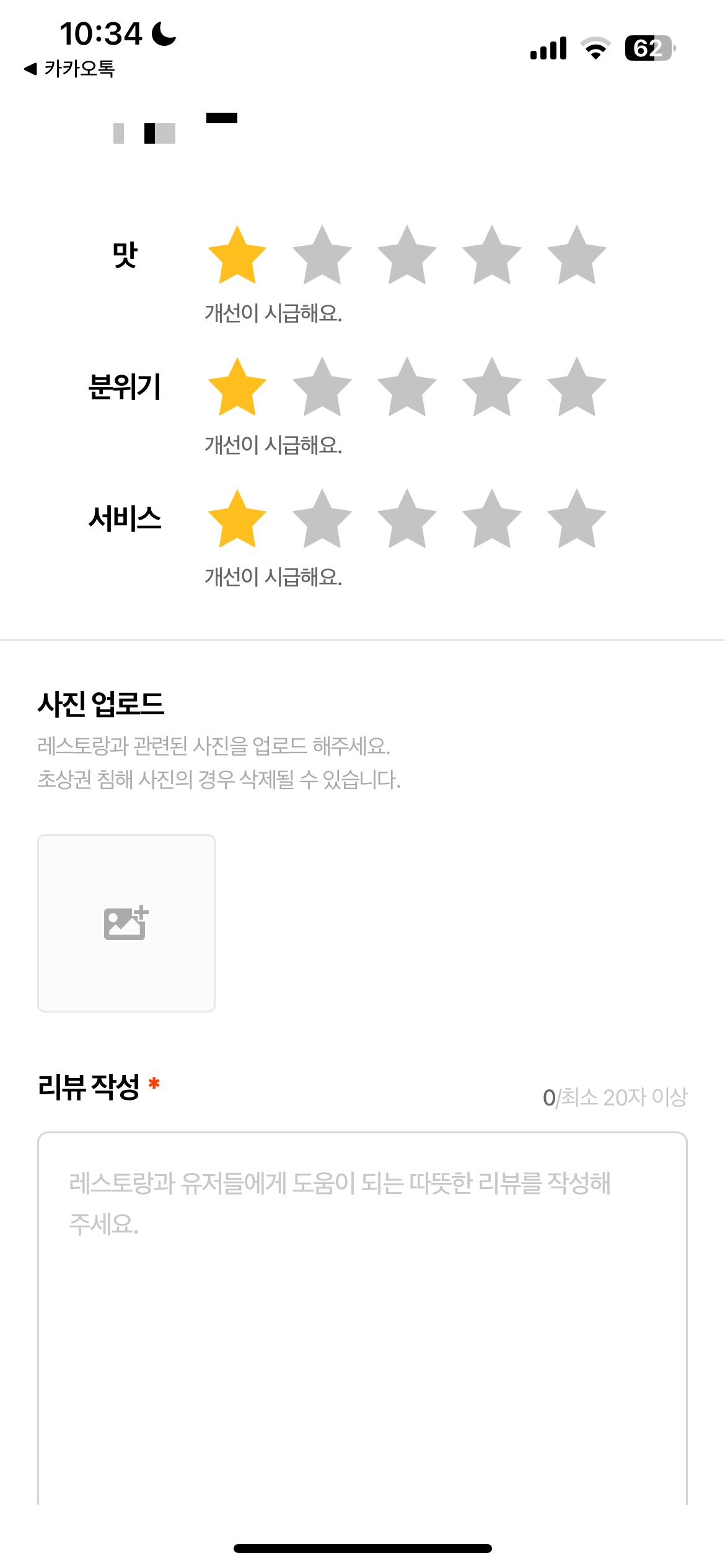 - 최소 20자 이상 작성하라고 적혀있으나, 1자만 적어도 리뷰 등록 가능함