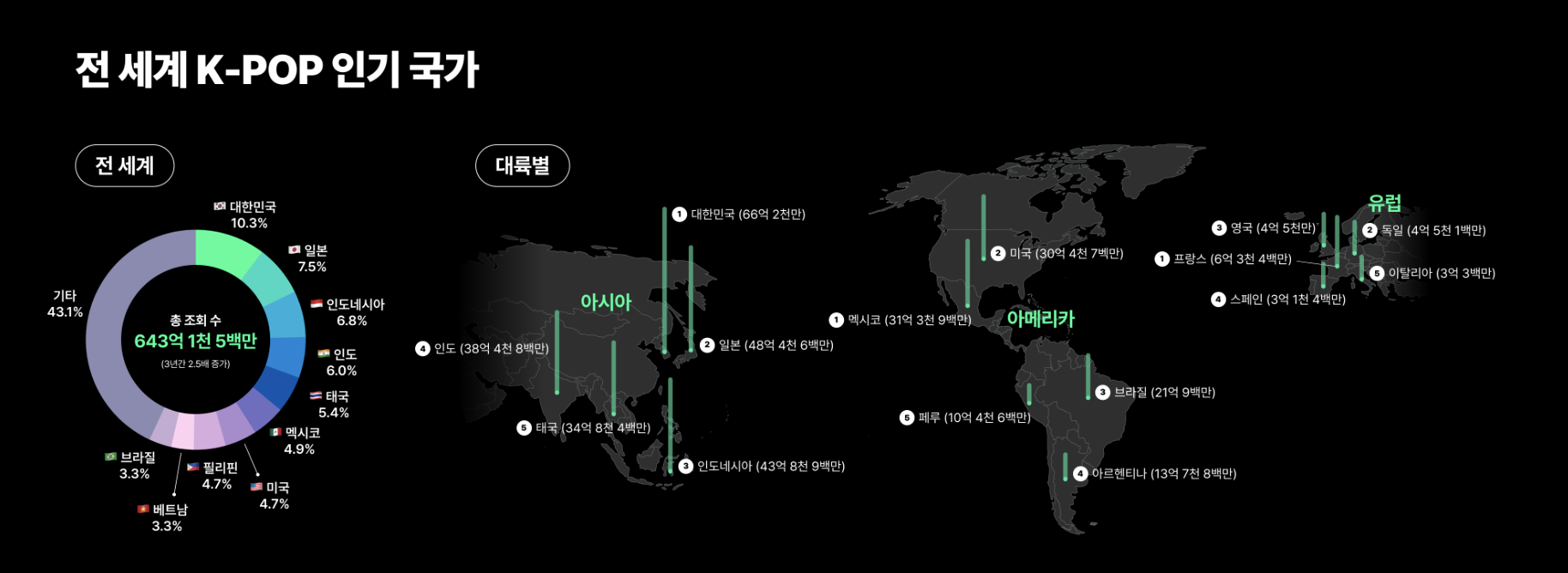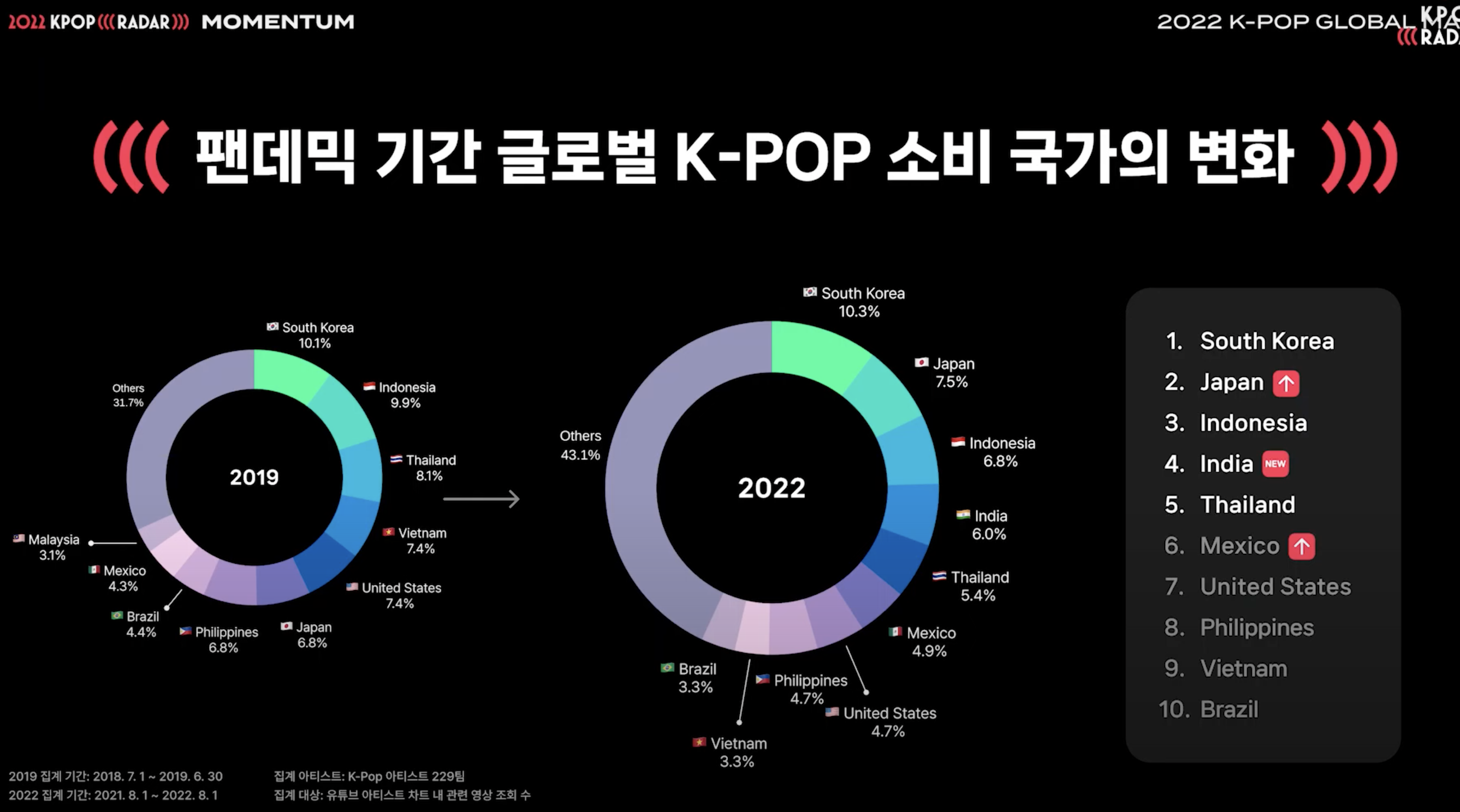 - 케이팝레이더가 발표한 ‘2022 케이팝 세계지도’ 에 따르면, 케이팝 소비량이 팬데믹 기간 동안 폭발적으로 증가(2.5배 가량)