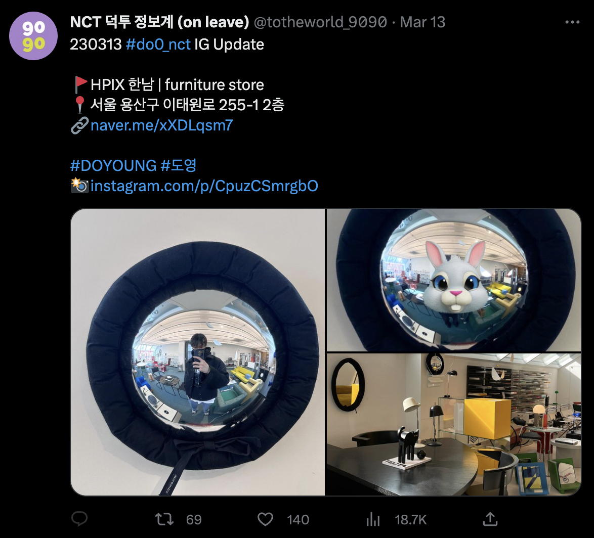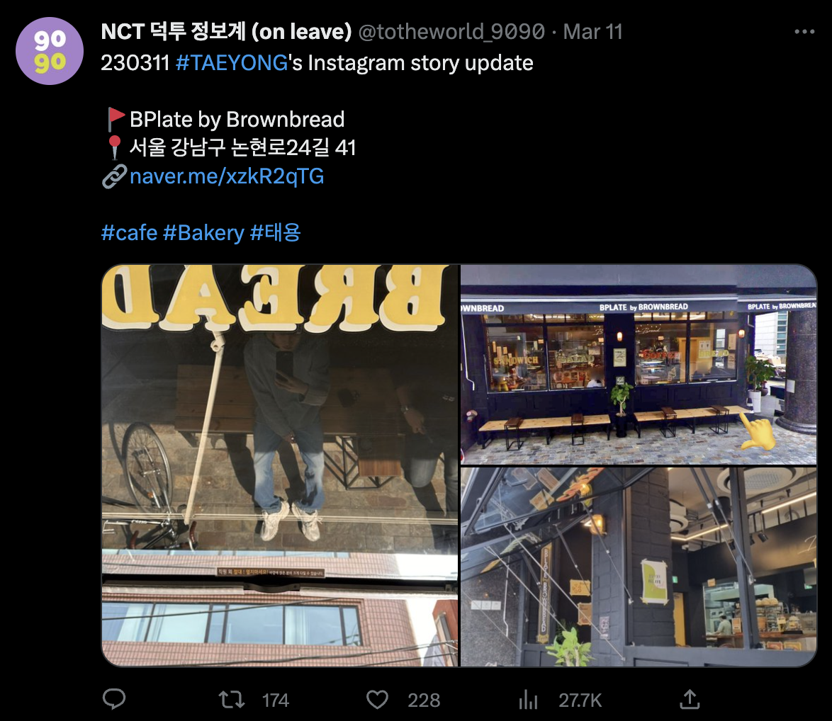 - K-POP 아티스트가 방문한 카페, 맛집 등은 팬들을 중심으로 트위터로 주로 빠르게 공유되는 실정
