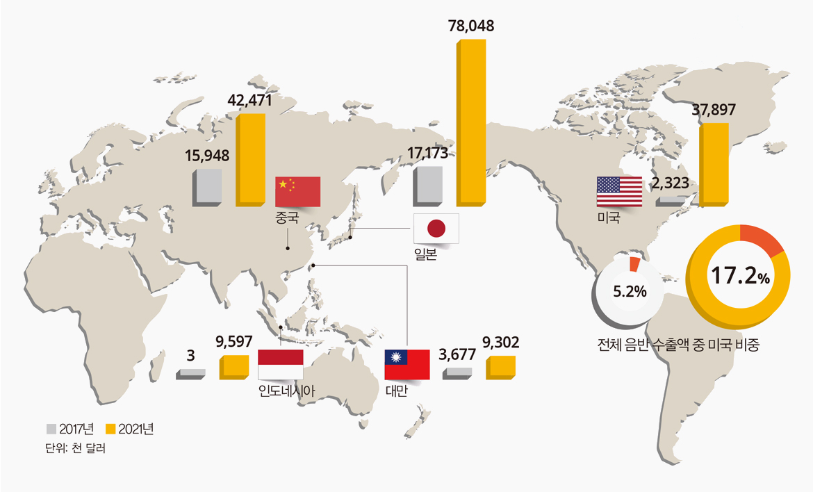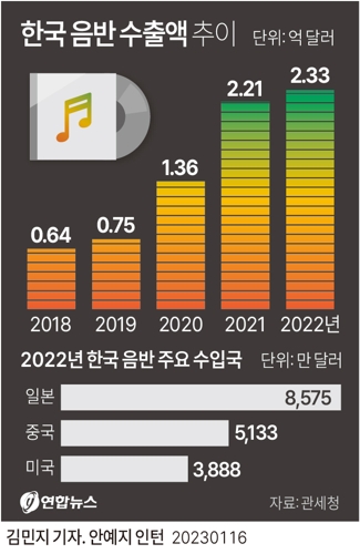 - 2022년 우리나라 음반을 가장 많이 수입해 간 국가는 **일본으로 8,574만9천달러(약 1,065억원)**를 기록