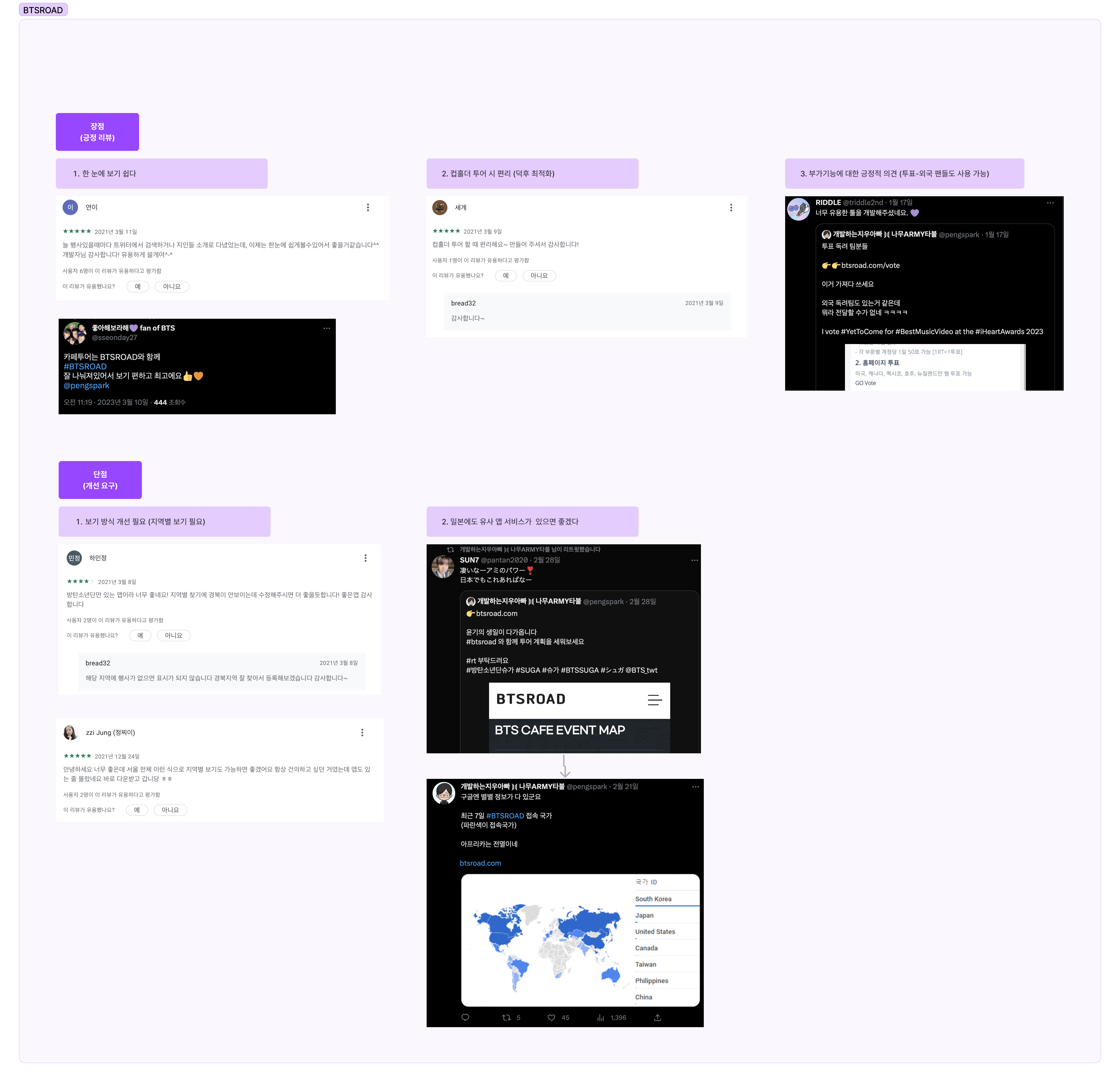 - K-pop 관련 국내 여행 단계를 여행 전, 여행 중, 여행 후 3가지 단계를 나누어 각 단계별로 유저의 페인포인트/니즈 발견 및 기능 도출