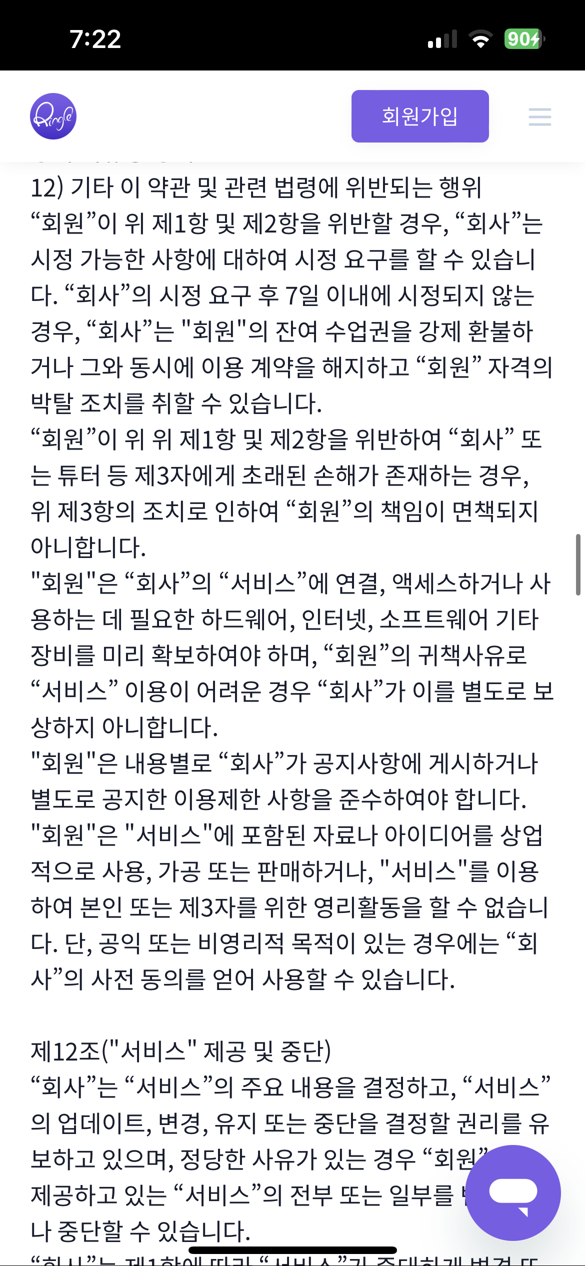- "회원"이 위 제1항(회원 정보 허위 기재) 제2항(부정 아이디 생성 및 이용)을 위반할 경우. "회사"는 시정 가능한 사항에 대하여 시정 요구를 할 수 있습니다. "회사"의 시정 요구 후 7일 이내에 시정되지 않는 경우, "회사"는 "회원"의 잔여 수업권을 강제 환불하거나 그와 동시에 이용 계약을 해지하고 "회원" 자격의 박탈 조치를 취할 수 있습니다.