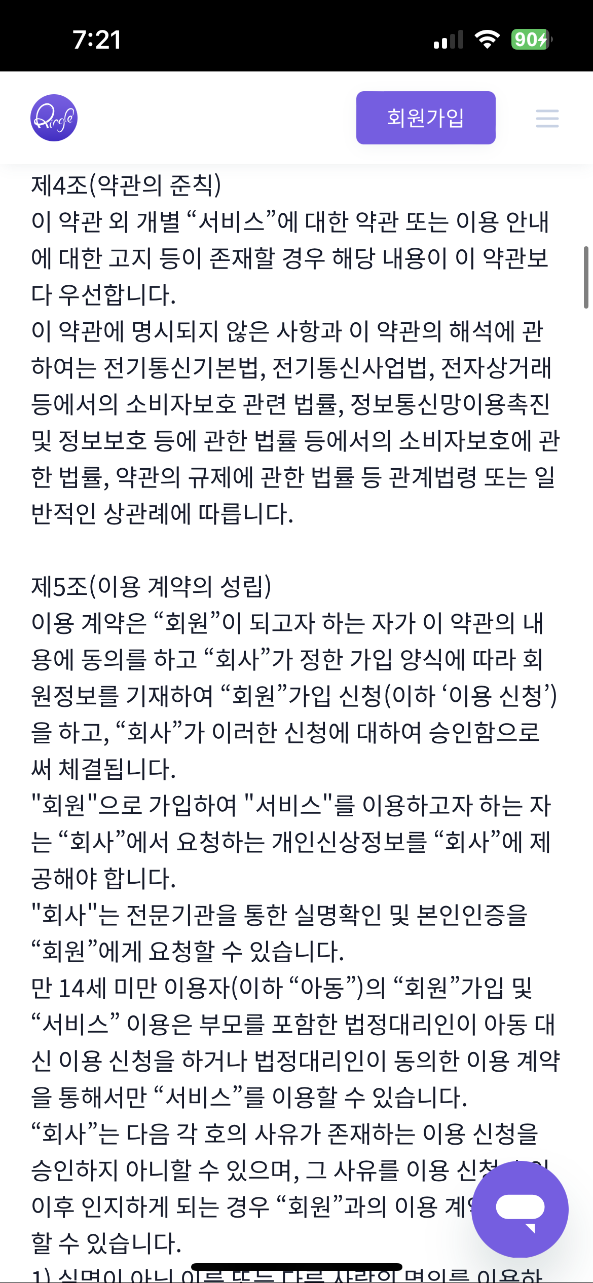 - 만 14세 미만 이용자(이하 "아동")은 "회원"가입 및 "서비스"이용은 부모를 포함한 법정대리인이 아동 대신 이용 신청을 하거나 법정대리인이 동의한 이용 계약을 통해서만 "서비스"를 이용할 수 있습니다.