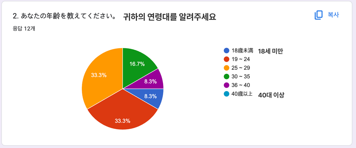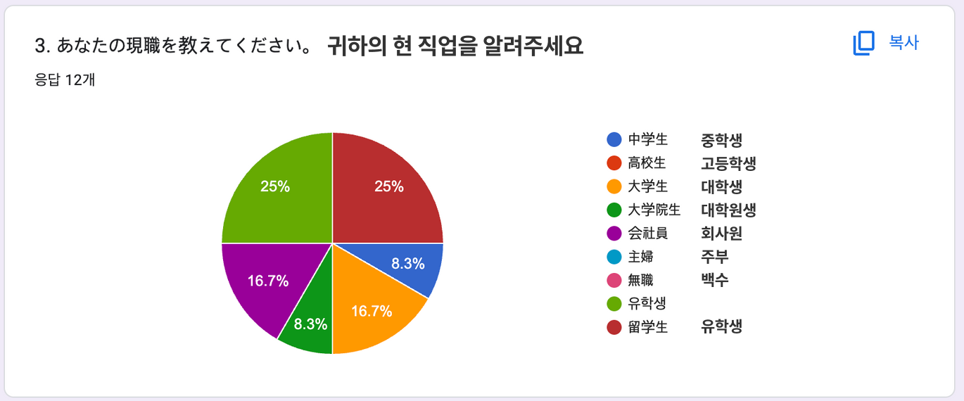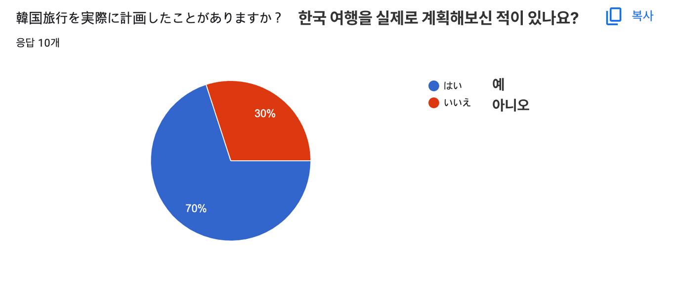 - 기간: 2023.3.16~2023.3.25 현재 영어 설문조사 7명, 일본어 설문조사 12명 진행 (진행중)