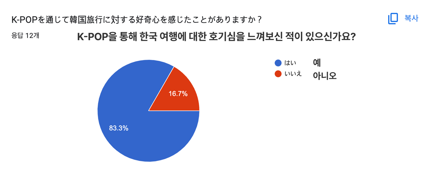 - K-POP을 통해 한국 여행에 대한 호기심이 생겼다(83%), 실제로 한국 여행을 계획해봤다(70%)는 답변이 높았음(가설 2 검증).