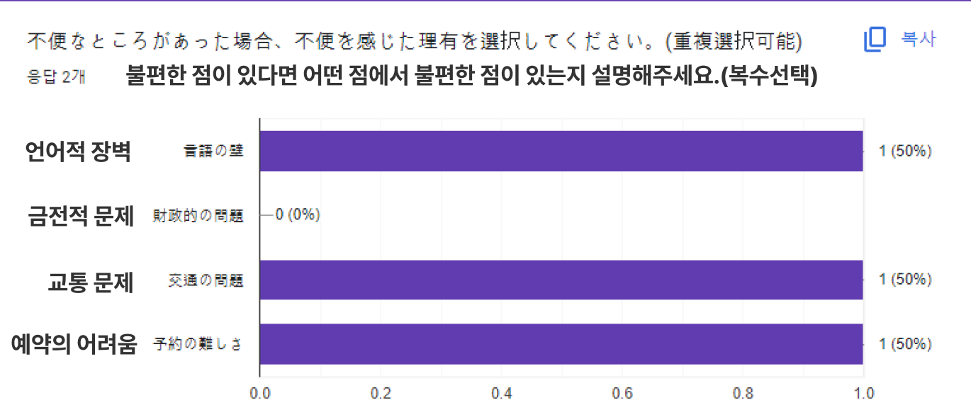 - 한국 여행 시 불편한 점으로 언어 장벽, 교통 문제, 예약의 어려움이 응답되었음(적은 표본수의 문제로 가설 4 미검증).