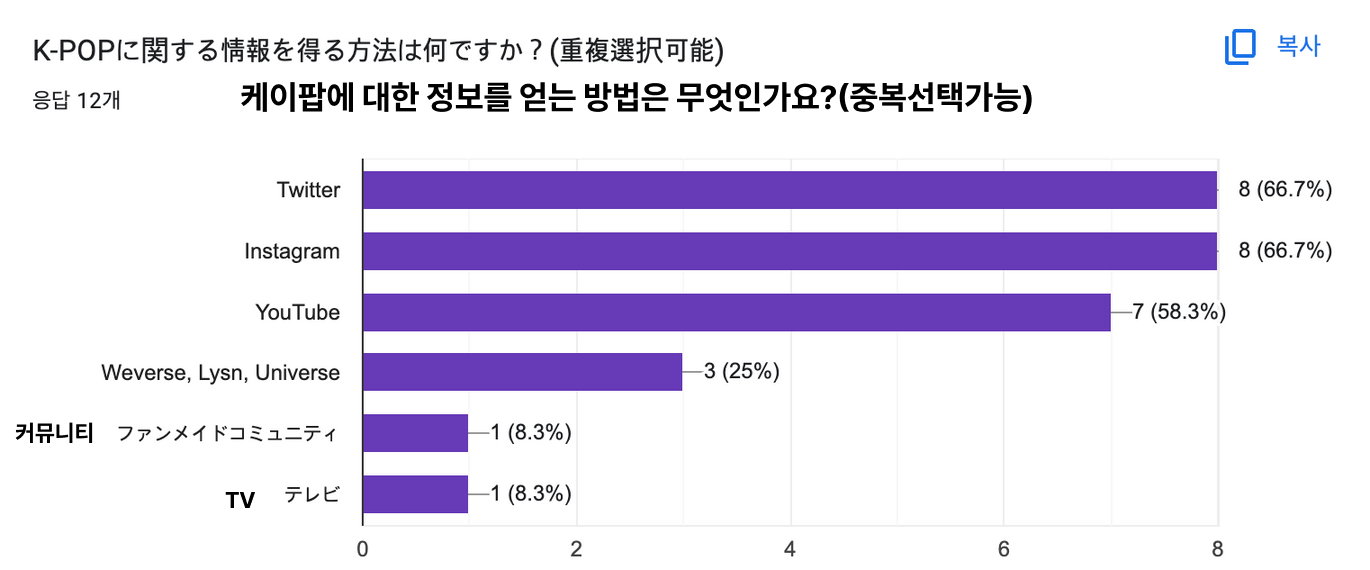- 설문조사 중간 점검 결과, 일본인 K-POP 팬들은 K-POP에 대한 정보를 주로 트위터, 인스타그램 등 다양한 SNS 채널을 사용하여 얻고 있었음(가설 1 검증).