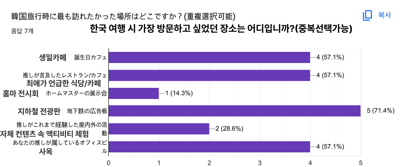 - 한국 여행 시 최애 멤버의 사진이 걸려 있는 지하철 전광판, 생일카페, 최애가 언급한 식당/카페, 최애가 소속된 회사 사옥 등에 방문 의사가 있었으며, 실제로 해당 장소들을 방문했다는 응답이 다수였음(가설 3 검증).