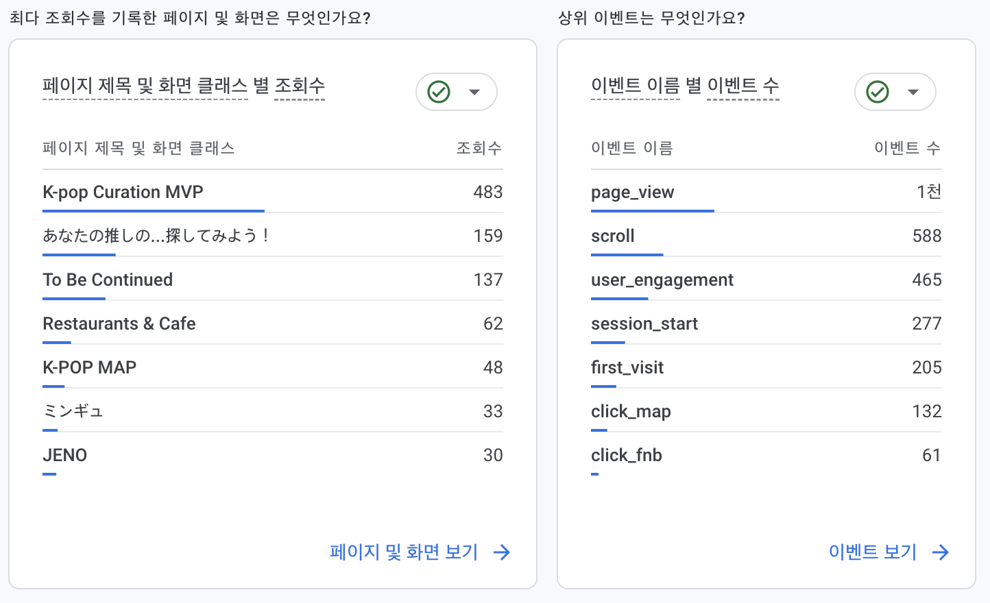 - 인덱스 페이지 K-pop Curation MVP의 조회수 483회, "click_map" 이벤트 수 132회로 클릭율 27%