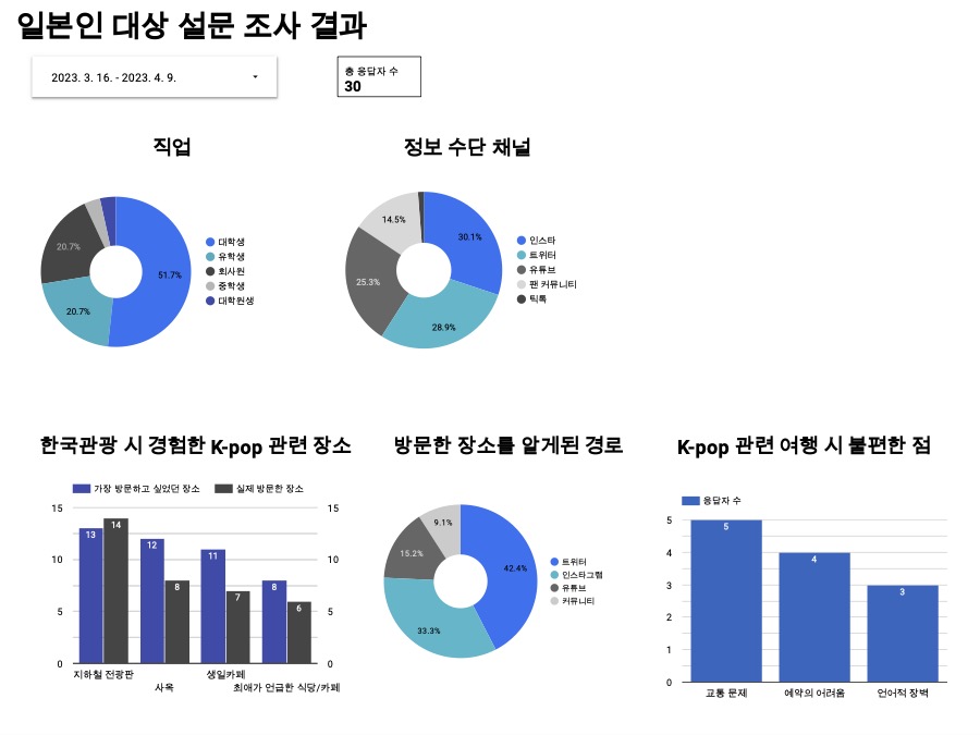 - 기존 설문조사를 통해 K-POP을 좋아하는 일본인들의 1)한국 여행 시 가장 방문하고 싶은 장소와 2)실제 방문한 장소를 파악할 수 있었다.