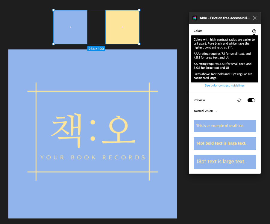 물음표 위를 호버하면 contrast ratio에 대한 설명을 알 수 있다.