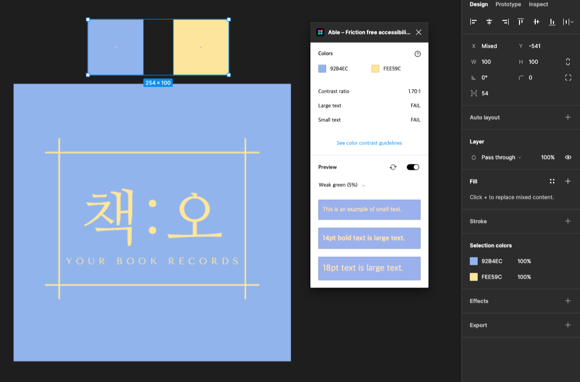 그러면 이렇게 Contrast radio와 함께 접근성을 확인할 수 있다. 나의 경우 Large text, Small text 모두 FAIL이라고 쓰여진 것을 확인할 수 있다.