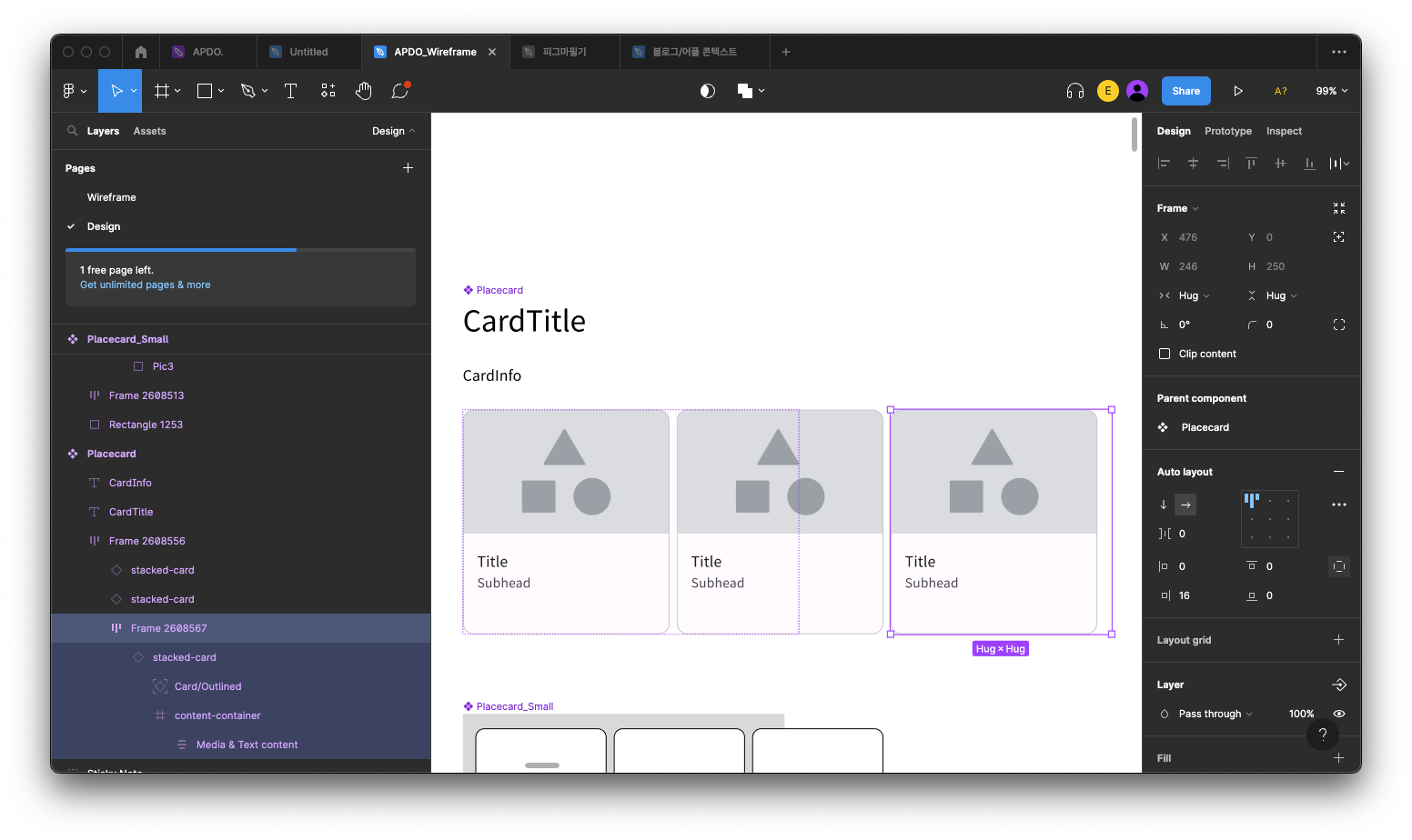 여기서 꿀팁! 나의 경우 마지막 카드를 따로 오토레이아웃 처리를 한 다음, right padding을 16을 주었다. 이유는 첫번째 카드에 left padding을 16을 주었는데, 이 패딩값을 가로스크롤 시 오른쪽 카드가 노출될 때도 동일하게 맞춰주기 위함이다. 이러면 카드 양쪽 패딩값이 동일하게 16이 되면서 레이아웃이 훨씬 깔끔하고 정갈해보인다!!