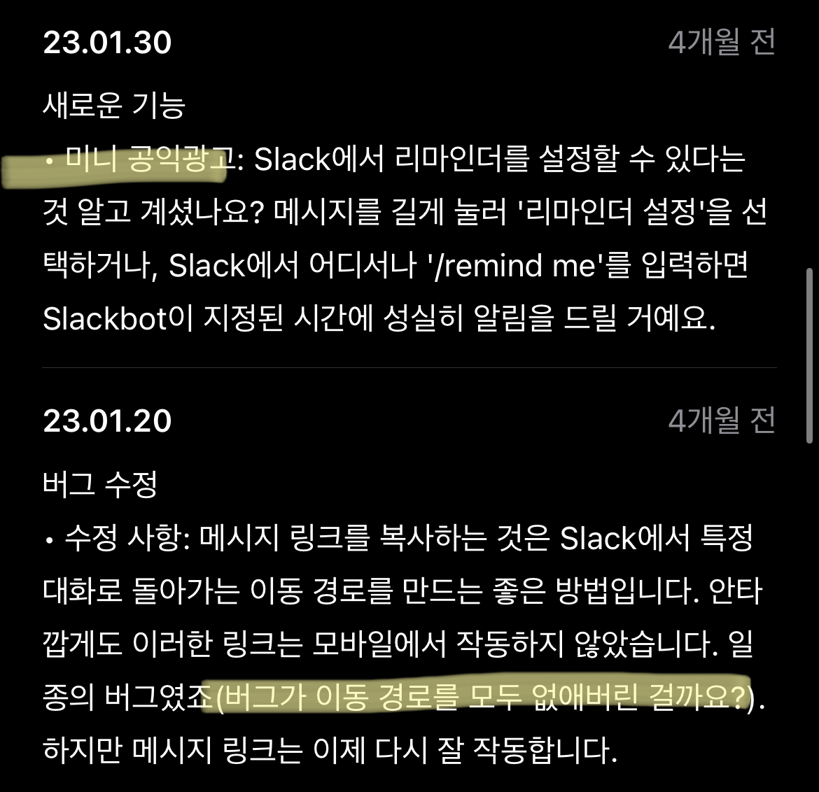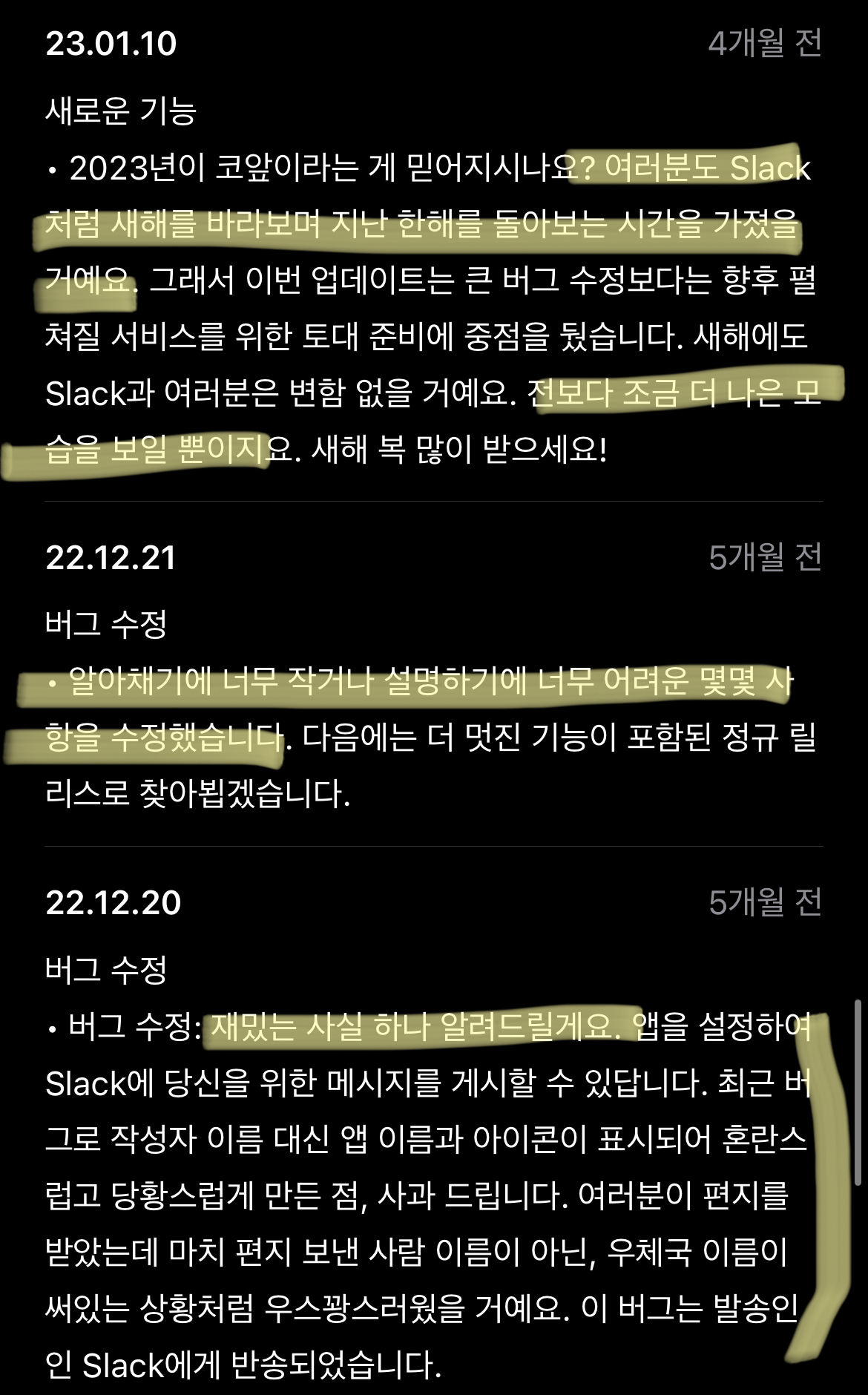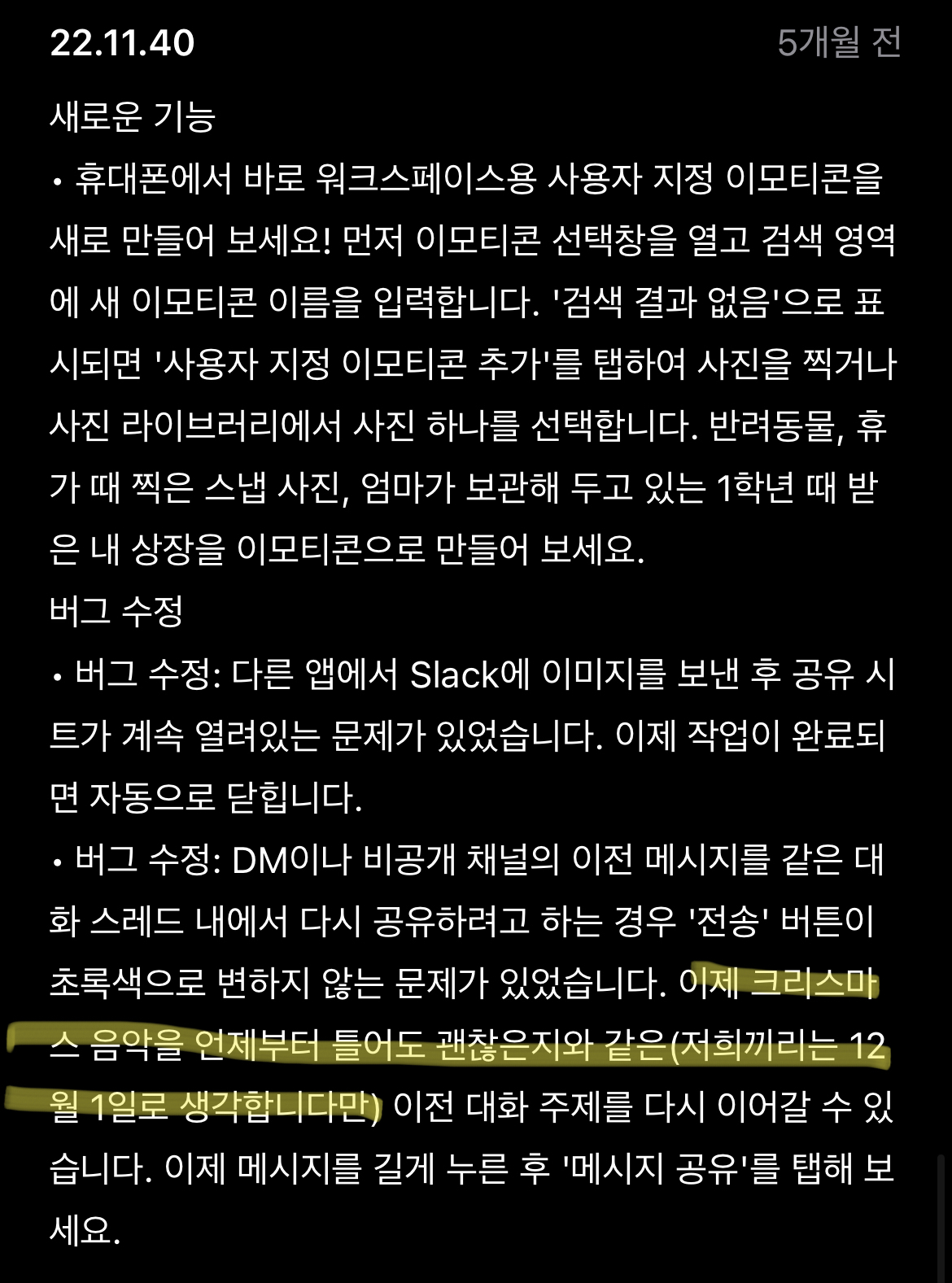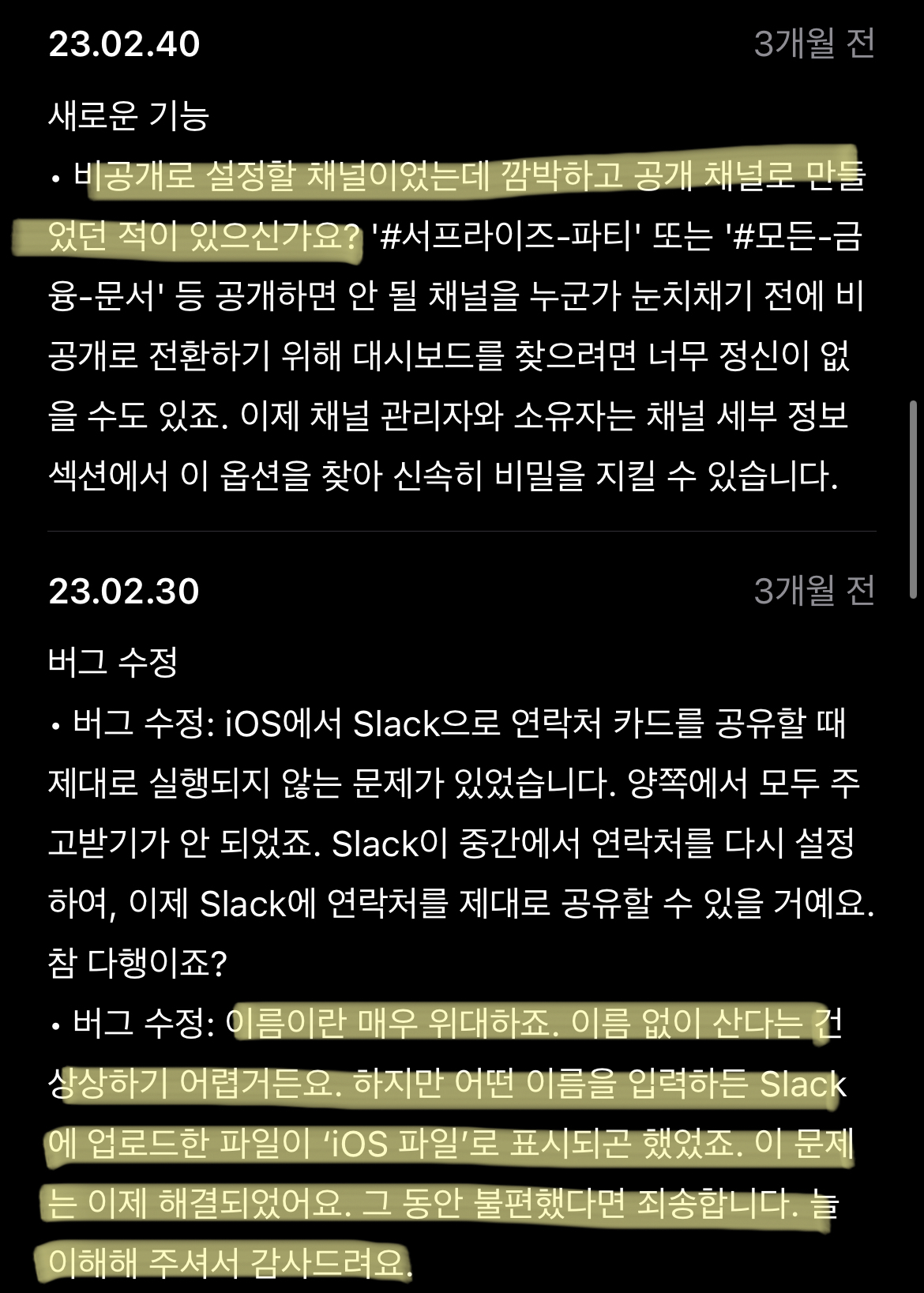 어플들 버전 기록 문구들을 공부하다가 발견한 슬랙 버전 기록.