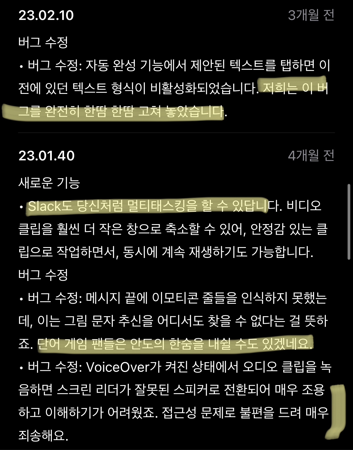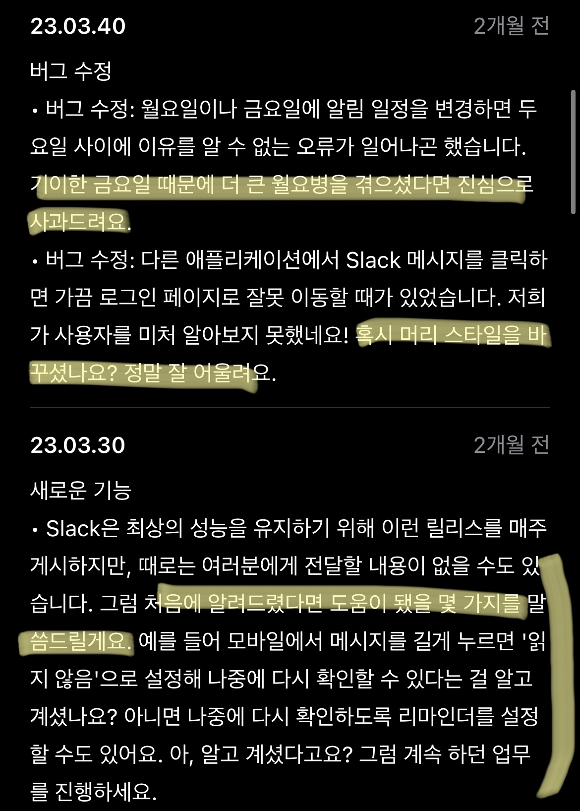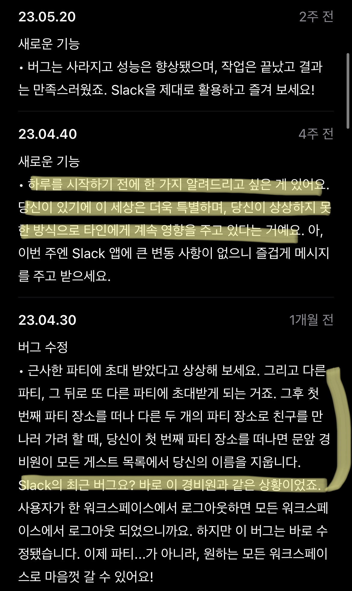 슬랙의 버전 기록 문구 중에서 가장 마음에 드는 문구 3가지는 다음과 같다.