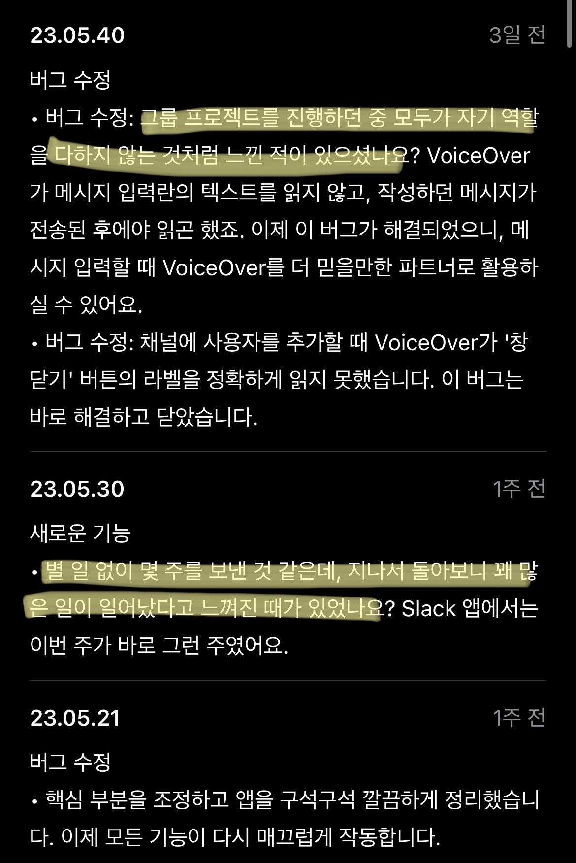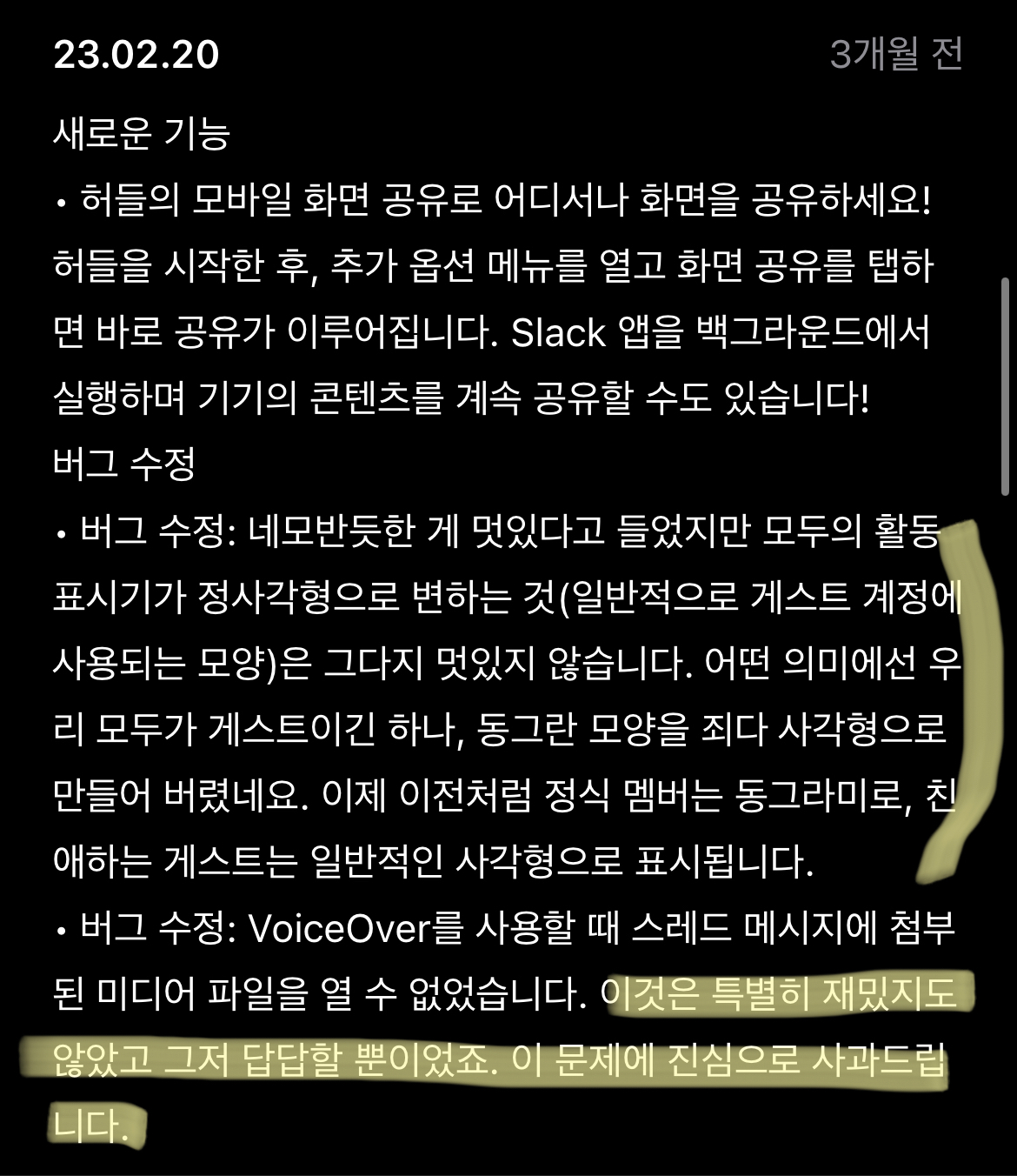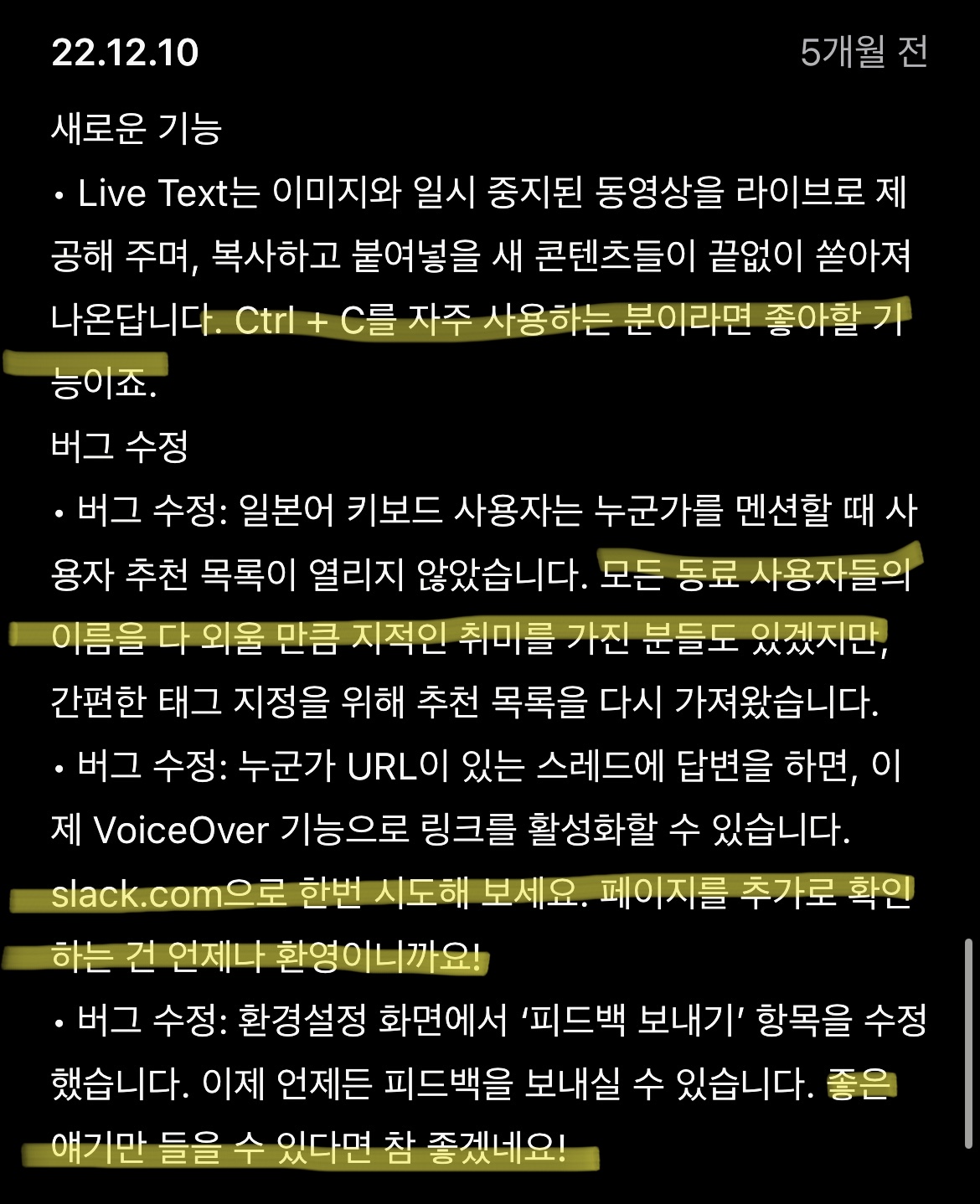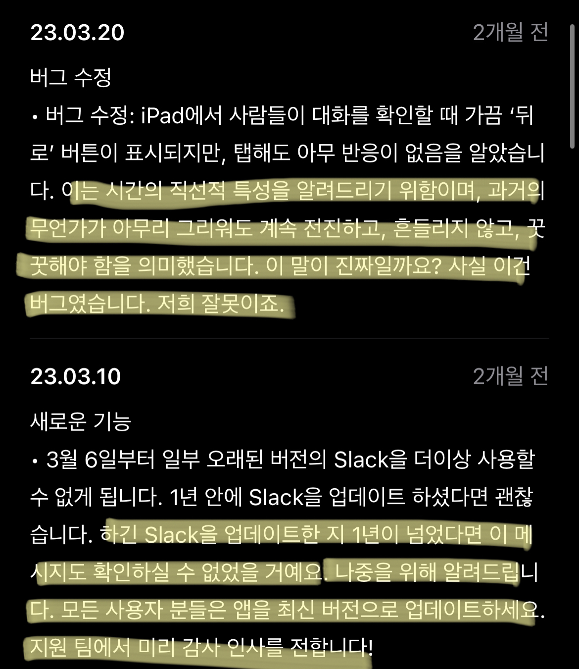 슬랙의 버전 기록 문구 중에서 가장 마음에 드는 문구 3가지는 다음과 같다.