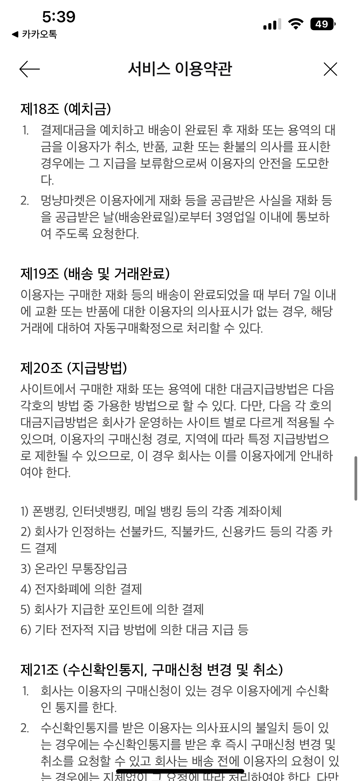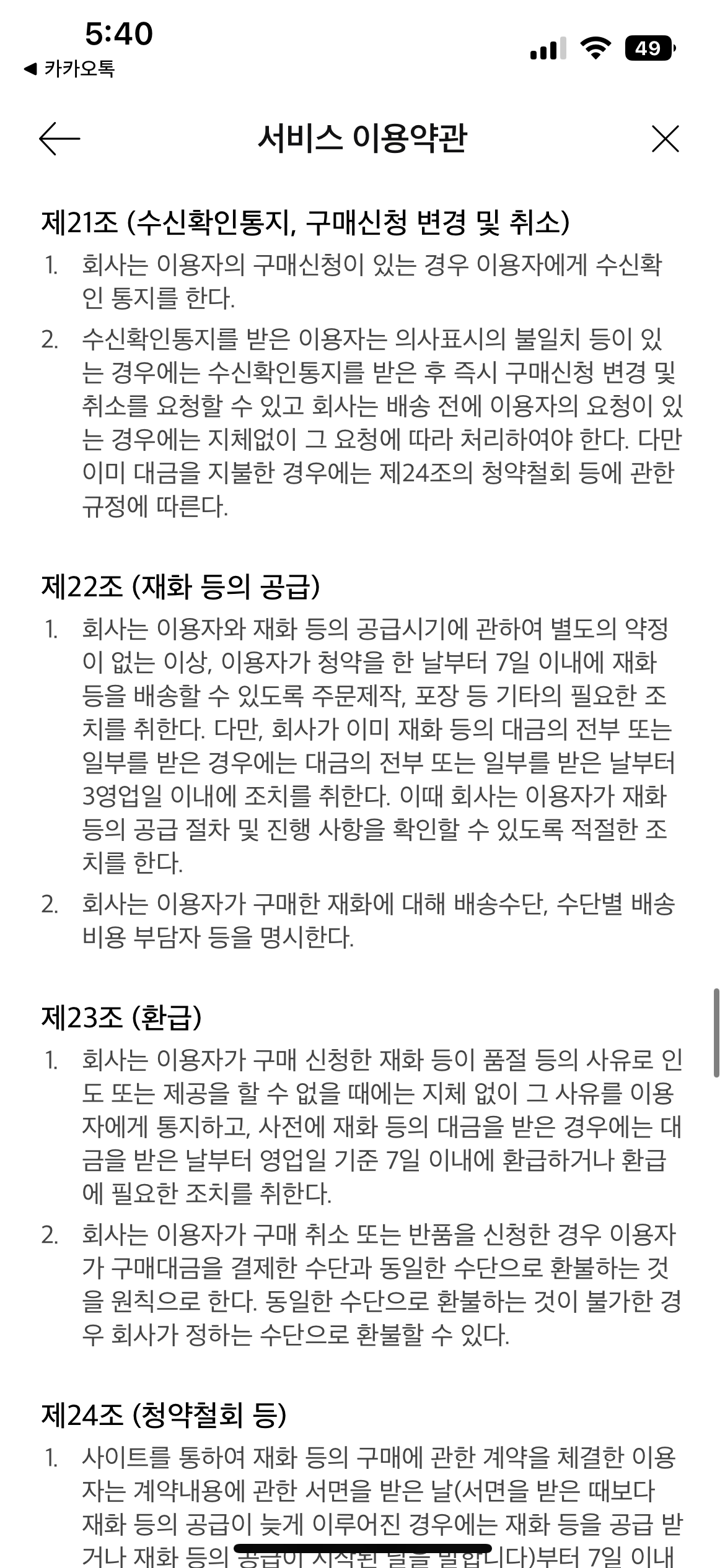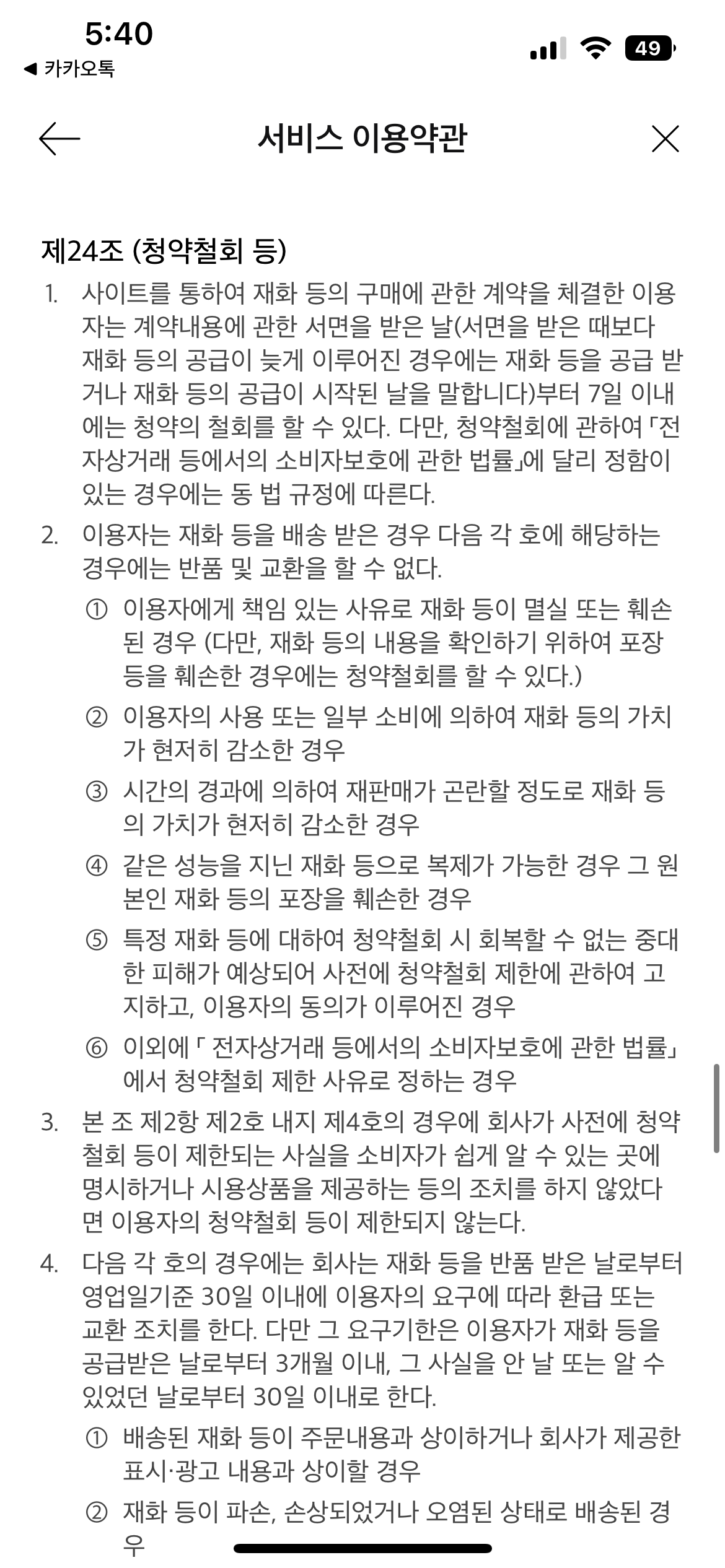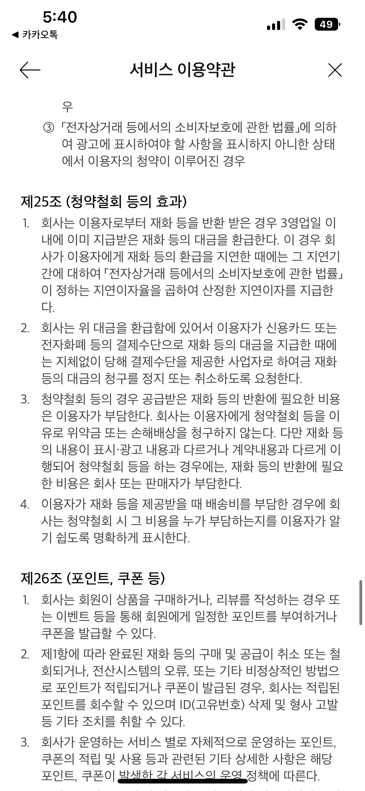 25조3항: 청약철회 등의 경우 공급받은 재화 등의 반환에 필요한 비용은 이용자가 부담한다. 회사는 이용자에게 청약철회 등을 이유로 위약금 또는 손해배상을 청구하지 않는다. 다만 재화 등의 내용이 표시, 광고 내용과 다르거나 계약내용과 다르게 이행되어 청약철회 등을 하는 경우에는, 재화 등의 반환에 필요한 비용은 회사 또는 판매자가 부담한다.