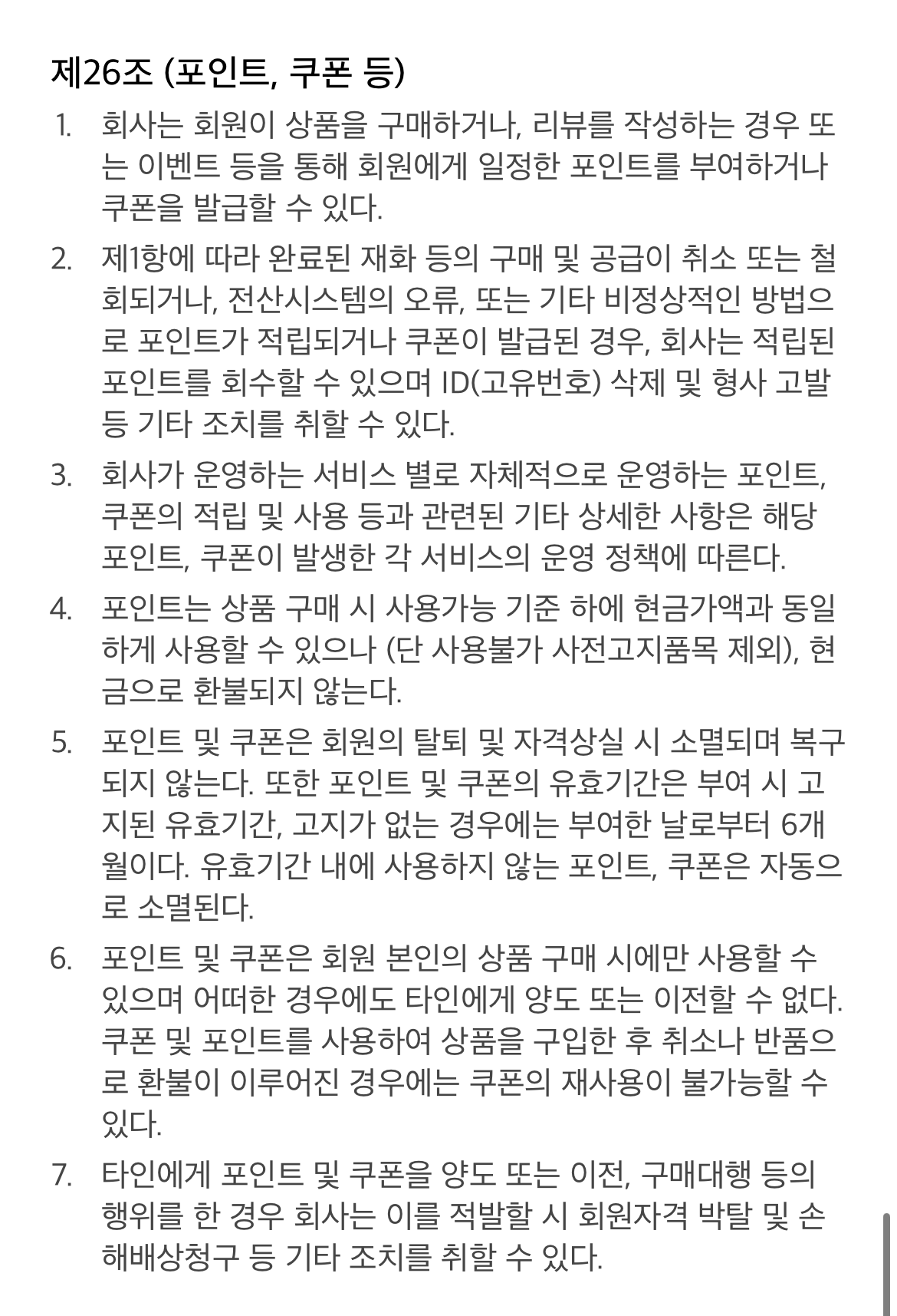 26조 5항: 포인트 및 쿠폰은 회원의 탈퇴 및 자격상실 시 소멸되며 복구되지 않는다. 또한 포인트 및 쿠폰의 유효기간은 부여 시 고지된 유효기간, 고지가 없는 경우에는 부여한 날로부터 6개월이다. 유효기간 내에 사용하지 않는 포인트, 쿠폰은 자동으로 소멸된다.