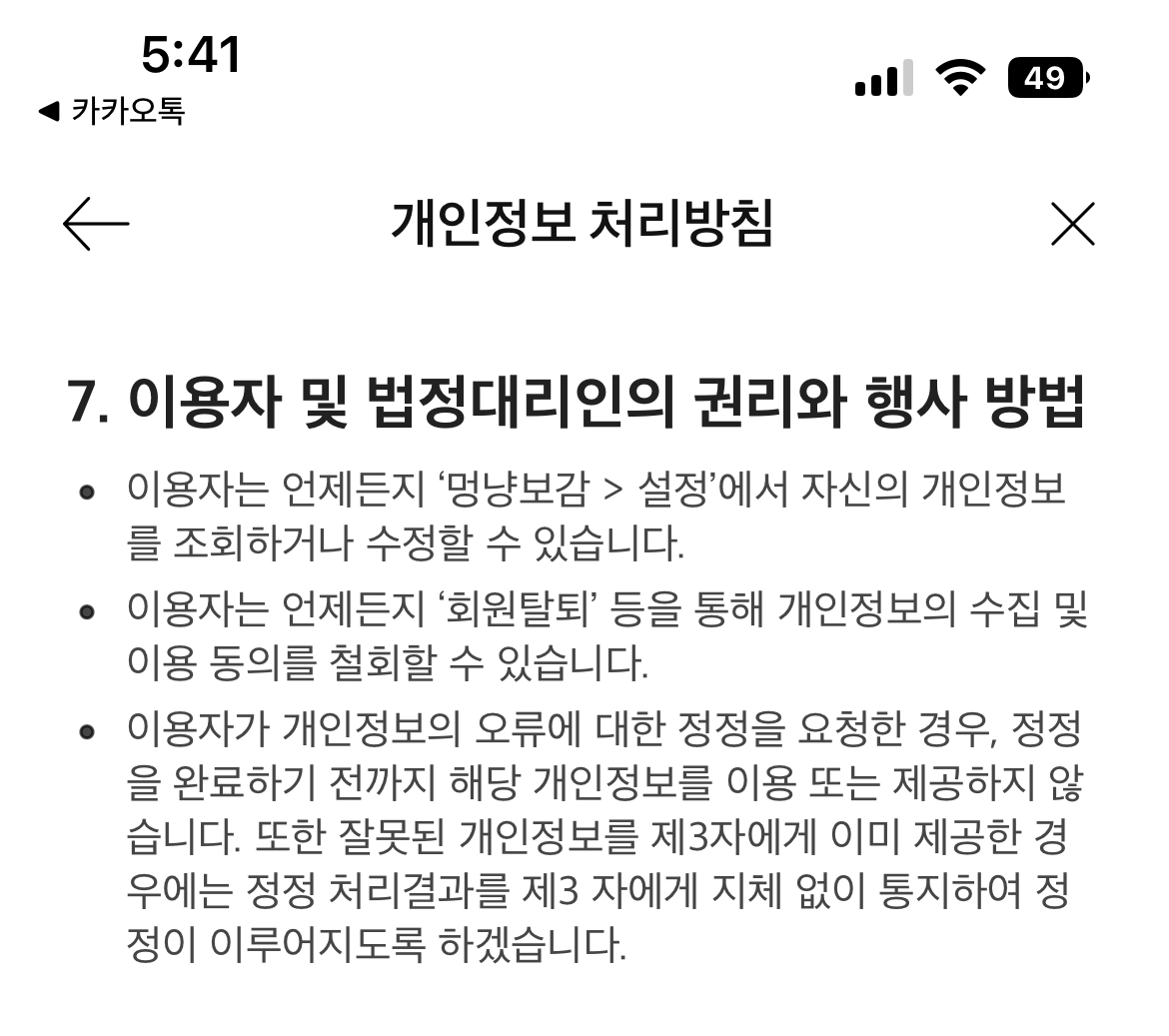 30조 7항: 회원을 탈퇴하는 경우 회원이 멍냥보감 내에 게시한 콘텐츠는 삭제된다.