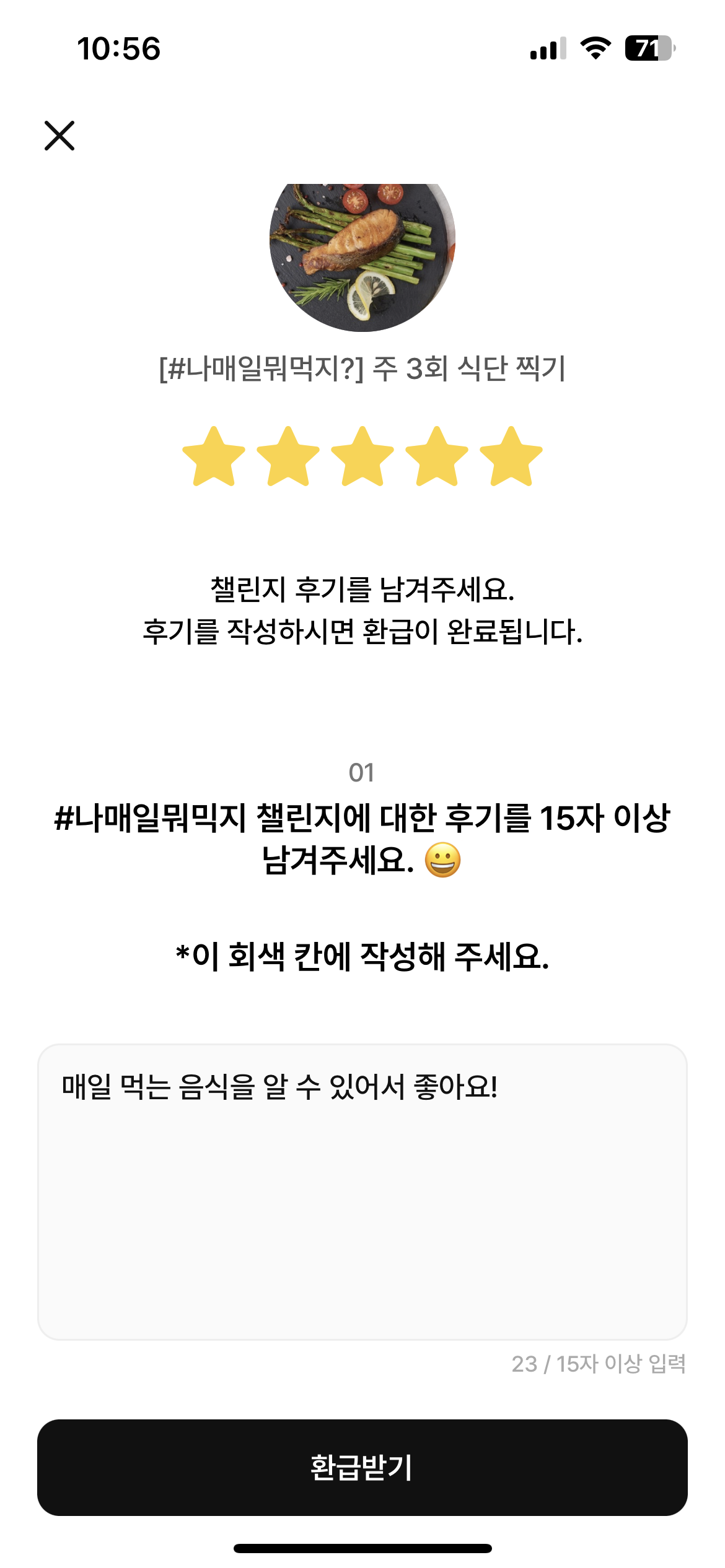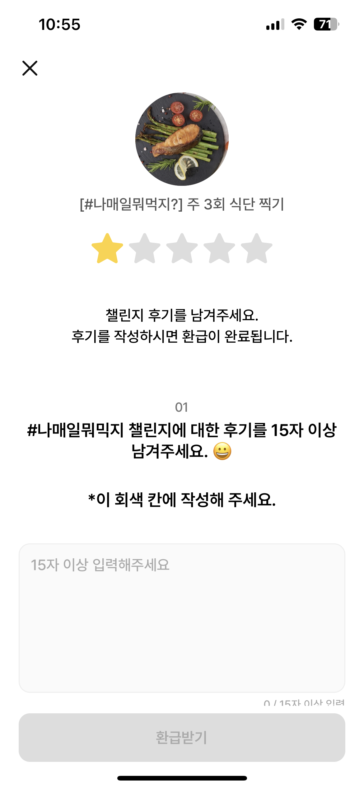 어차피 환급금을 받으려면 리뷰는 반드시 작성해야 하는데, 리뷰를 2뎁스로 나눠서 텍스트 리뷰를 추가적인 작업으로 느껴지게 하지 말고 첫 리뷰 작성 페이지에서 텍스트 필드를 한 번에 보여주는 것도 괜찮지 않냐는 생각이 들었다.