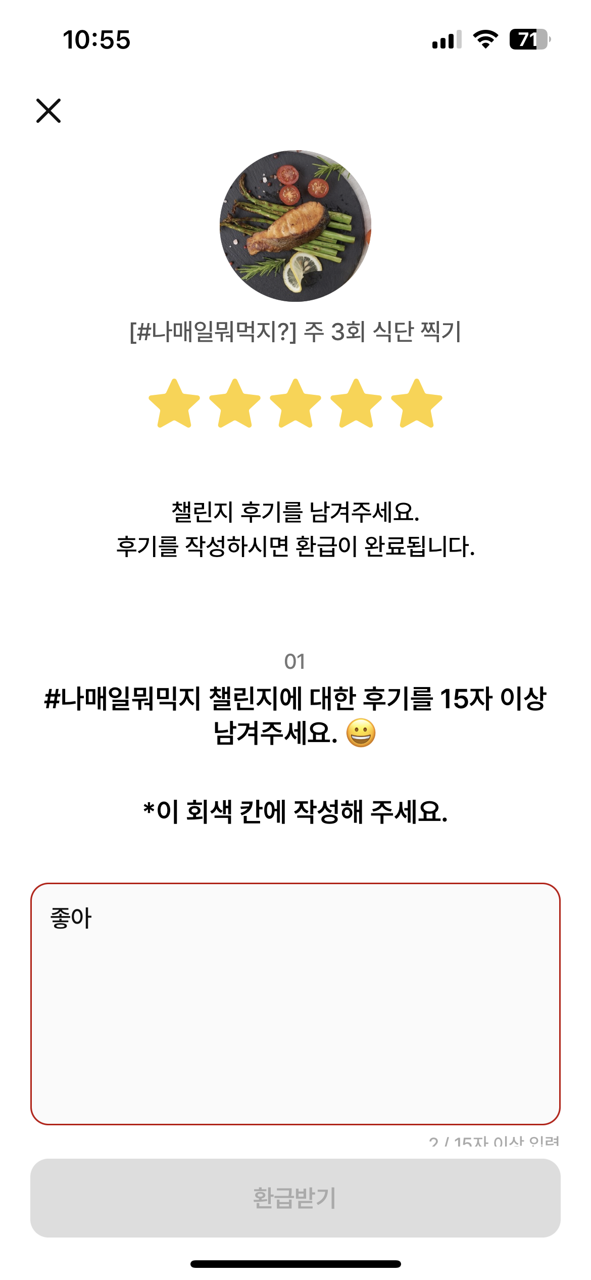 - 15자 이상 작성 시 텍스트 리뷰 붉은 테두리 사라짐 + 환급받기 버튼 검정색 출력