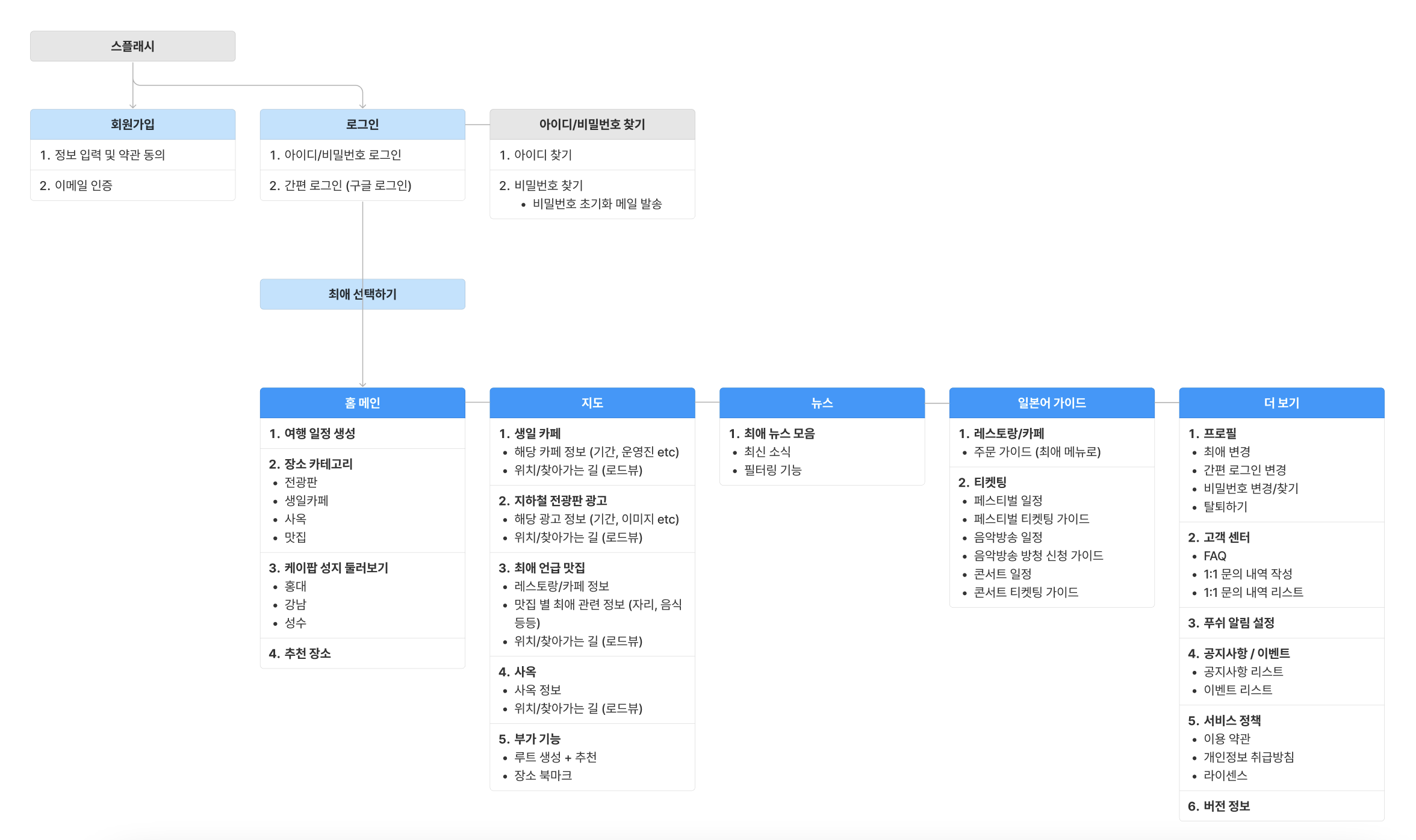 프로토타이핑을 진행하면서 프로젝트 6주차에 작성했던 IA와 상세 기능 구조가 달라진 부분이 발생하였다. 홈 메인 화면의 구성이 달라져 프로토타입 완성 후 IA를 수정하였다.