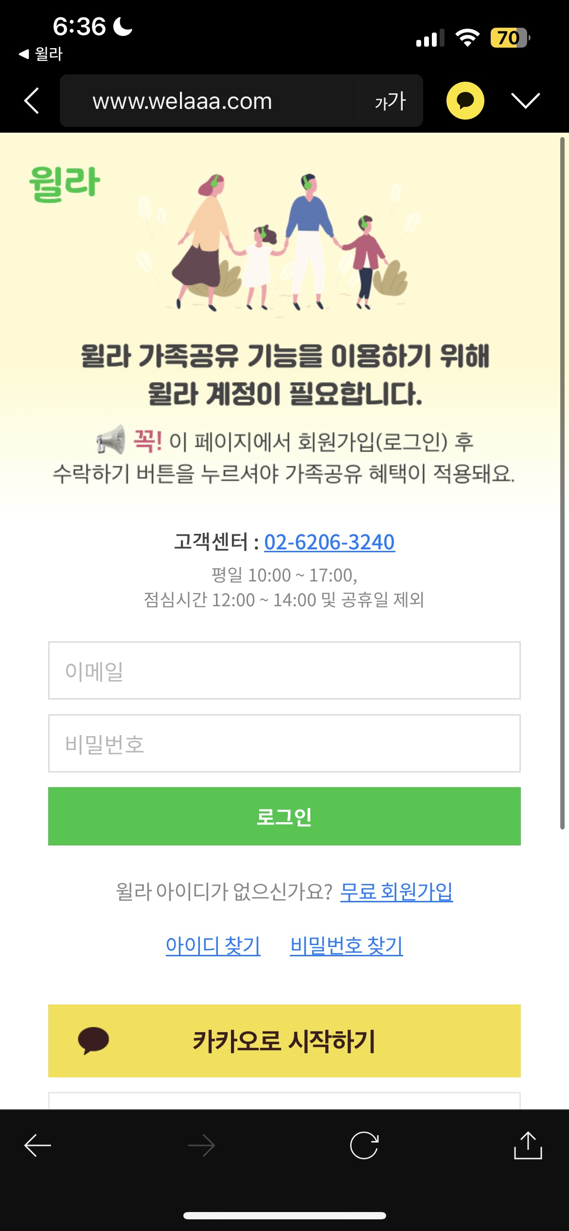 윌라의 경우 "가족 회원" 이란 "가족 공유 기능을 통해 초대받은 회원"을 의미하기 때문에, "가족 대표" 회원이 가족 공유 기능을 통해 보낸 초대 페이지에서 회원가입(로그인) 후 수락하기 버튼을 눌러야만 가족공유 혜택이 적용된다는 특징이 있다.